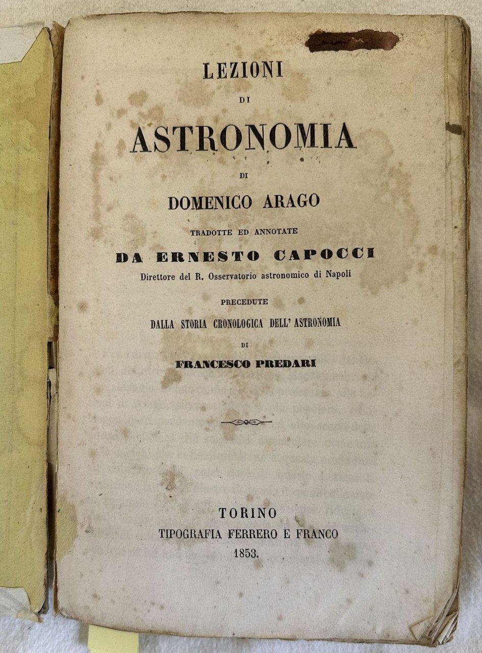 LEZIONI DI ASTRONOMIA DI DOMENICO ARAGO TRADOTTE ED ANNOTATE DA ERNESTO CAPOCCI DIRETTORE DEL R. OSSERVATORIO ATSRONOMICO DI NAPOLI PRECEDUTE DALLA STORIA CRONOLOGICA DELL'ASTRONOMIA DI FRANCESCO PREDARI