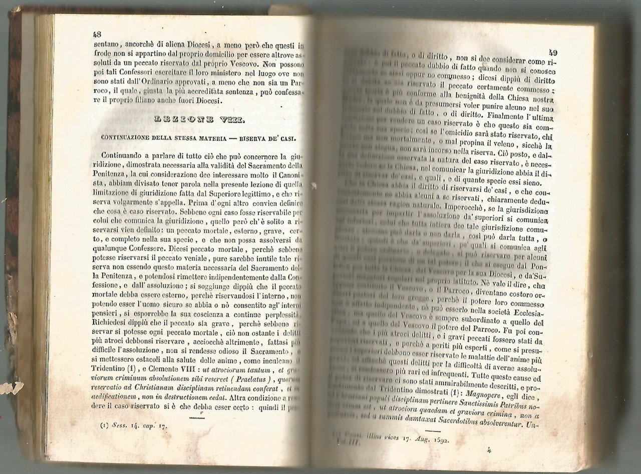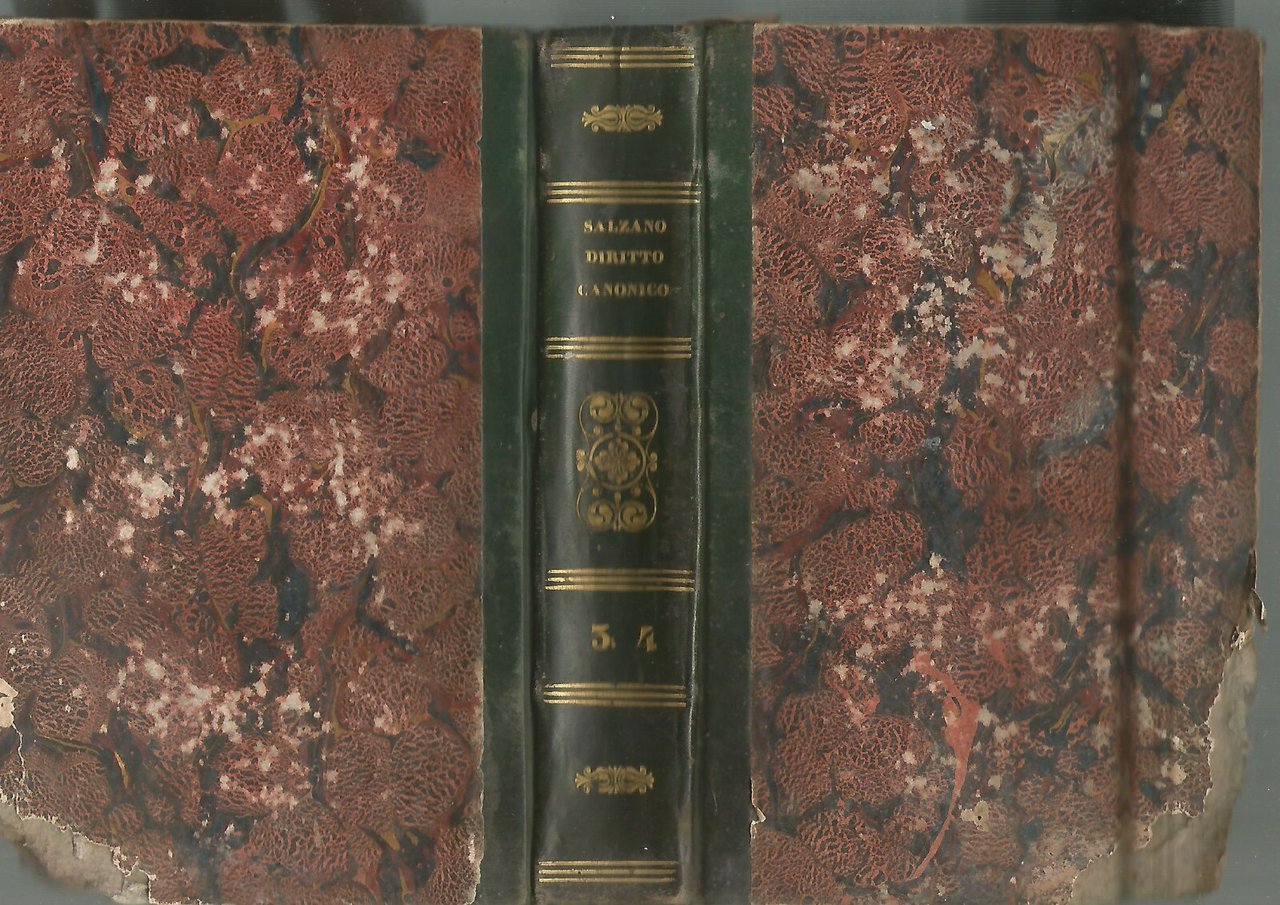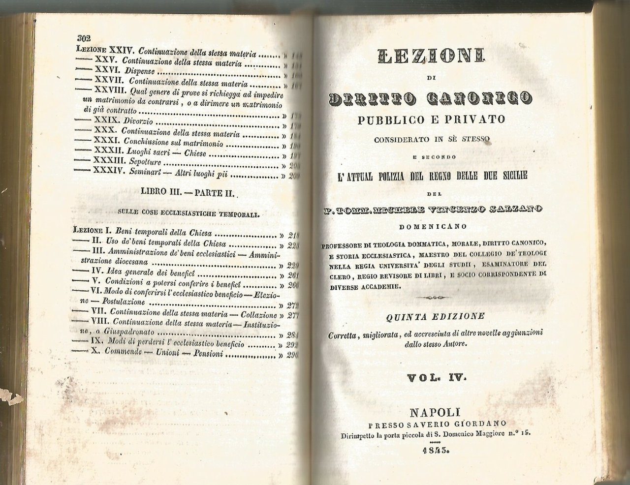OPERA COMPLETA DI QUATTRO TOMI IN DUE VOLUMI LEZIONI DI DIRITTO CANONICO PUBBLICO E PRIVATO considerato in se stesso e secondo l'attual polizia del Regno delle Due Sicilie di P. Tommaso Michele Vincenzo Salzano.