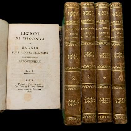 In 8°; 5 tomi: 292 pp., 311, (1) pp., 286, (2) pp., 305, (3) pp., 257, (3) pp. Legature coeve in mezza-pelle chiara con titolo, autore, numero del volume e ricchi fregi in oro al dorso. Piatti foderati in carta marmorizzata coeva. Prima, assai rara, edizione italiana della più importante opera del celebre filosofo francese, Pierre Laromiguière (3 November 1756 12 August 1837). Professore di filosofia all'Università di Tolosa prima professore di Logica all'Ecole Normale di Parigi poi, fu autori di diversi importanti scritti di filosofia politica. Nel 1793 pubblica la sua opera più celebre e significativa Projet d'éléments de métaphysique qui tradotta. La sua opera filosofica è fortemente legata agli sviluppi della psicologia. Contrapposto fortemente alla psicologia fisiologica di Cabanis, l'autore elabora una netta distinzione fra i fenomeni psicologici chiaramente riconducibili ad aspetti puramente fisiologici e fenomeni psicologici legati all'anima ed alla sua esistenza. Allievo di Condillac e debitore per gran parte della sua ideologia ad Antoine Destutt de Tracy, attribuì maggiore importanza all '"attenzione" come facoltà psichica. Nell'elaborazione della sua filosofia, portando alle estreme conseguenze la sua visione gnoseologica, Laromiguiere arriva a metter in dubbio l'utilità stessa delle scienze naturali ritenendo le scoperte di questa come semplicemente, non sono altro che reiterazione in altro linguaggio delle stesse verità. Seppur Jouffroy e Hippolyte Taine, lo descrissero come uno dei più importanti pensatori del XIX° secolo, la sua opera rimase a lungo quasi del tutto sconosciuta in Italia. Questa prima edizione italiana si deve all'intuizione di un geniale piccolo editore pavese, Defendente Sacchi, che nella prima metà del XIX° secolo, ebbe l'idea di tradurre alcune opere di metafisica, che avevano avuto grande successo all'estero ma che avevano incontrato un'accoglienza, perlomeno, tiepida in Italia, tanto da non venire nemmeno tradotte nella nostra lingua. Defendente Sacchi fu un editore dalla notevole curiosità culturale, particolarmente interessato agli studi metafisici, tanto da ideare, insieme a Germani Giuseppe e Rolla Luigi, una vera e propria collana filosofica, la Collezione dei Classici Metafisici che vide fra i titoli tradotti, varie prime edizioni italiane di Locke, Hume, Malebranche, Condillac e pochi altri. Fino alla pubblicazione della Critica della Ragione pura, forse la sua opera edita più importante, la collana era composta solo di 26 volumi. Seppur le traduzioni delle opere furono commissionate da Defendente a traduttori tutt'altro che professionali, l'impatto delle edizioni di Sacchi fu notevole tanto ad esempio, che la la sua edizione della Critica Kantiana portò il titolo ad essere inserito, per la prima volta, nell'Indice dei Libri Proibiti, decine anni dopo la prima edizione vera e propria dell'opera. La stampa dell'edizione è fisicamente tirata dal tipografo Pietro Bizzoni, personaggio molto noto, tipografo della Regia Università, e stampatore di testi altamente specializzati in materia medica (a lui ad esempio si deve la prima edizione di una delle opere di Antonio Scarpa) ma anche di critica letteraria e linguistica. La dicitura tipografica i Collettori, si riferisce a Defendente Sacchi, Luigi Rolla e Giuseppe Germani curatori, appunto, della Collezione dei Classici Metafisici. Opera assai rara.