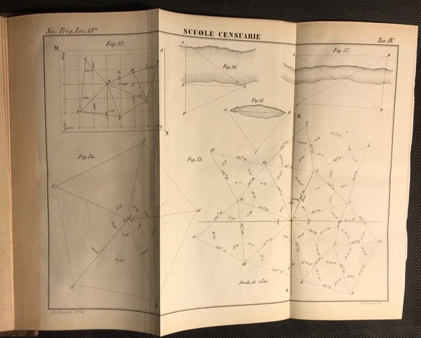 Mezza pelle coeva con titoli e fregi dorati sul dorso, in 8vo cm15x23.5, pp (8) 368; 14 tavole ripiegate, diverrse tabelle nt. Opera divisa in due parti, geometrica e trigonometrica; illustrazioni tecniche con strumenti di misura.