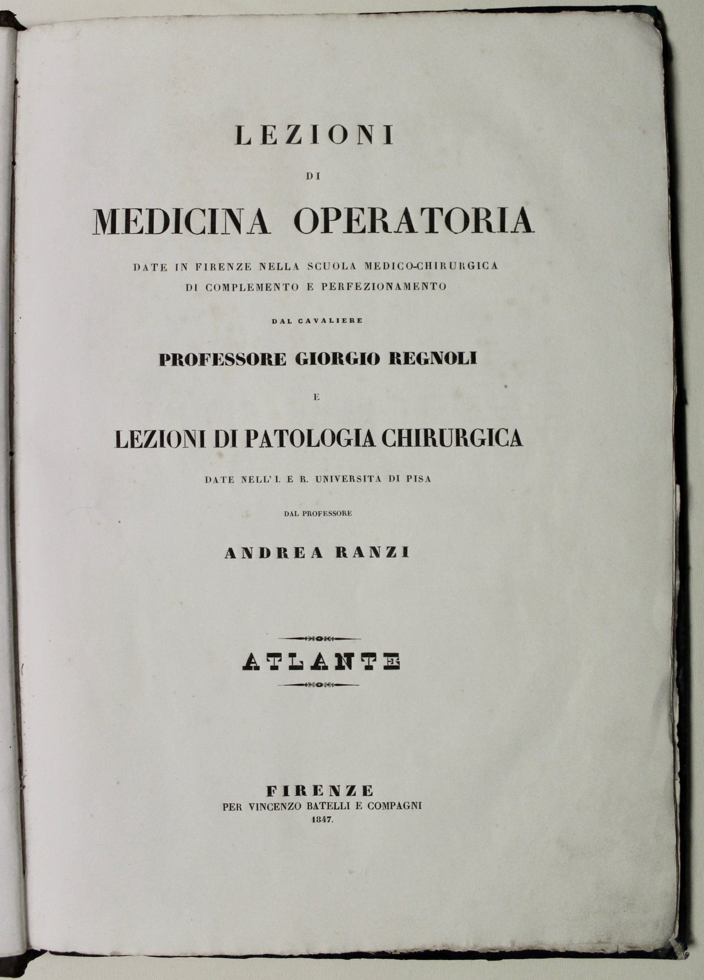 In folio (mm 260x380); pagg. 27, (1), XLIV tavv. incise in rame da Ferdinando Lasinio a piena pag. f.t., alcune a colori, una ripiegata più volte, le tavv. raffigurano interventi di vario genere di medicina operatoria e patologia chirurgica.<BR>Mezza pelle coeva con titolo al dorso inciso in oro e fregi a piccoli ferri, dorso a scomparti. Interessante e assai dettagliato Atlante generale anatomico chirurgico, quasi sempre mancante ai 4 volumi di testo redatti da Giorgio Regnoli, insigne medico chirurgo, che per diciotto anni fu direttore della Clinica Chirurgica dell'Ospedale Santa Chiara di Pisa. Nel 1846 il Granduca regnante volle poi trasferirlo alla Scuola Medico-Chirurgica di complemento e perfezionamento di Firenze: "anno 1846 ad idem magisterium in Nosocomio FIorentino S. Mariae Novae provectus est".<BR>Durante la sua brillante carriera Regnoli si occupò prevalentemente di chirurgia del cavo orale e diede un forte impulso soprattutto alla chirurgia della lingua, tanto da legare il suo nome ad un tecnica operatoria per i tumori della base di questo organo: la tecnica soprajoidea mediana. Bell'esemplare con barbe. Lievi mende agli angoli inf. dei piatti, alcune abrasioni a cuffie e spigoli. <BR>