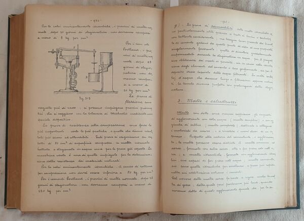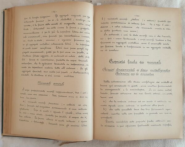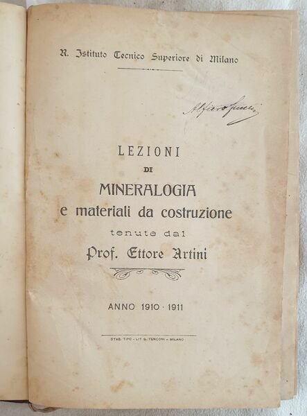Rarissima raccolta di appunti delle lezioni di mineralogia e materiali da costruzione tenute dal Prof. Ettore Artini (1866-1928) celebre mineralogista e accademico italiano. Laureatosi a Firenze nel 1887 sotto al guida di Carlo de Stefani, fu assistente alla Cattedra di mineralogia a Padova e poi a Milano, dove fu anche direttore del Museo Civico di storia naturale che sotto il suo comando ebbe un notevole sviluppo. Questa lezioni, redatte in copia manoscritta e si riferiscono all'anno accademico 1910-1911. Il volume può essere considerato una bozza del volume a stampa che verrà poi pubblicato nel 1920. Firma al frontespizio. In buone condizioni e completo. Copertina in mezza pelle coeva con titolo e decorazioni in oro al dorso in buone condizioni generali con lievi usure e parti mancanti ai margini e dorso. Legatura in buone condizioni. All'interno le pagine si presentano in buone condizioni con rare fioriture. Strappo orizzontale riparato a pag. 17, 19, 23, 26, 28, 58, 63, 281. Testo mancante a pag. 23. Pagine dalla 393 ala 299 legate per errore tra la 408 e 409. In 4. cm 28x21. Pp. 1047+(1). Peso Kg. 2,750.Very scarce collection of noteds from the lessons of mienralogy and materials for construction held by Prof. Ettore Artini (1866-1928) famosu italian mineralogist and academical. He got a degree in florence in 1887 under the guide of Carlo de Stefani, fwas assistant of mienralogy in Padova and Milan, where he was also director of the civic Museum of Natural history which had a ide development under his control. The notes are in handwritten copy and refeer to academical year 1910-1911. The volume can be considered a proof of the definitive work that will be later published in 1920. Signature in the title page. In good conditions and complete. Half leather coeval cover with golden tiutle and decorations in the spine in good general conditions slightly worn in the edges and spine. Binding in good conditions. Inside pages are in good conditions with occasional foxings. SHorizontal tear repaired in pag. 17, 19, 23, 26, 28, 58, 63, 281. Missing text in pag. 23. Pagfes from 393 to 299 bound for a fault between 408 and 409. In 4. cm 28x21. Pp. 1047+(1). Weight Kg. 2,750