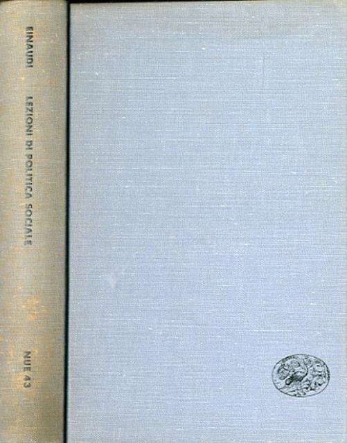 XXVII, 338 p. ; 20 x 12 cm. Nuova universale Einaudi, 43. Scritte nel 1944 nel divampare del secondo conflitto mondiale, e mentre l'Europa sembrava avviata verso un tragico destino, queste Lezioni di politica sociale di Luigi Einaudi, vanno considerate ancora oggi un libro esemplare, per lo stile inimitabile e la capacità sorprendente nutrita di concretezza, buon senso e passione civile, di cogliere l'essenza dei problemi posti dalla modernità. Nota introduttiva di Federico Caffè. Legatura editoriale. coperta in cartone rigido telato, manca la sovraccoperta originale. Qualche lieve segno del tempo al taglio e al dorso, per il resto libro integro. Codice libreria 6388.