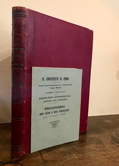 8vo (cm. 24,5), 351(1) pp. Testo in corsivo litografato (si unisce) R. Università di Roma, Corso pratico di psicologia sperimentale applicata alla pedagogia. Programma delle lezioni e delle dimostrazioni per l’anno 1907, 16mo (cm. 15,8), Roma, Tipo- Lit. Econ. 1907,18 pp., 1 c.nn. Brossura editoriale. Legatura coeva in mz. pelle rossa con fili e titolo impressi al ds. Alcune leggere sottolineature a matita rossa, altrimenti esemplare in ottimo stato di conservazione. Edizione rara non censita da ICCU in alcune biblioteca italiana. L’Autore è considerato uno dei fondatori della psicologia italiana: ebbe un ruolo sostanziale nello sviluppo e nella diffusione della materia in Italia fra ‘800 e ‘900. Nel 1898 promosse a Roma la fondazione dell’Associazione romana per la cura medico-pedagogica dei fanciulli anormali e nel 1899 aprì, in collaborazione con Maria Montessori, il primo asilo-scuola. Nel 1905 De Sanctis accettò la nomina a professore di Psicologia sperimentale presso la Facoltà di Medicina di Roma, dove nel 1907 fondò il primo Laboratorio italiano di psicologia sperimentale (cfr. ‘Archivio storico della psicologia italiana’).