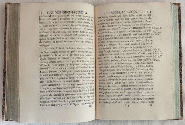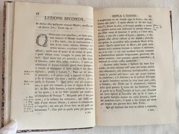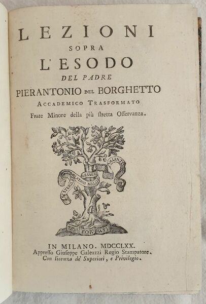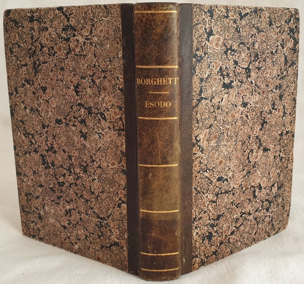 Interessante opera del 1770 di questa opera di esegesi biblica scritto dal Padre Pierantonio del Borghetto. Si tratta di una serie di lezioni sopra il libro dell'Esodo. In ottime condizioni e completo. Coperta in mezza pelle ottocentesca con titolo in oro al dorso in ottime condizioni generali con lievi usure ai margini e dorso. Legatura in buone condizioni. Pagine in ottime condizioni con rare fioriture. In 16. Dim. 18x13 cm. Pp. (8)+360+(2). Interesting work of 1770 of this work of Bible esegesis written by the Father Pierantonio del Borghetto. It is a series of lessons about the book of Hesodus. In very good conditions and complete. Half leather cover of 19th century with golden title in the spine in very good general conditions slightly worn in the edges and spine. Binding in good conditions. Pages are in very good conditions with occasional foxings. In 16. Dim. 18x13 cm. Pp. (8)+360+(2)
