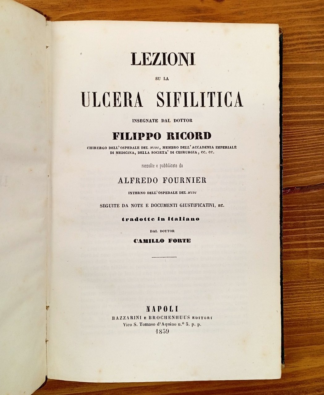 "insegnate dal dottor Filippo Ricord, raccolte e pubblicate da Alfredo Fournier - seguite da note e documenti giustificativi, ecc. - tradotte in italiano dal dottor Camillo Forte" - Volume rilegato in mezza pelle, titolo in oro al dorso, 285 pagine. Modesti segni d'uso e del tempo, nel complesso esemplare in ottime condizioni, testo fresco e perfettamente fruibile in ogni sua parte.