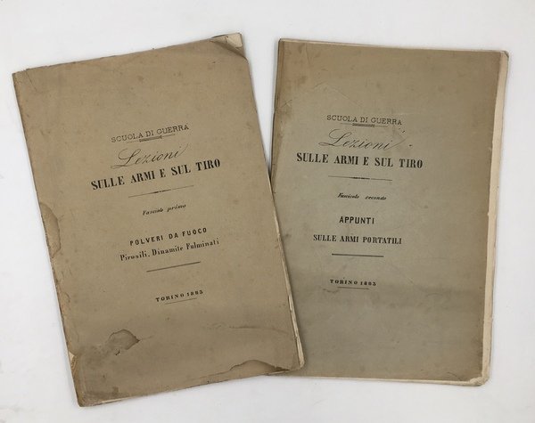 2 dispense di cm. 31,2x21,7, bross. edit., mende risarcite ai dorrsi e ai bordi dei piatti, ombre in cop., ottimi gli interni llitografati in eleganti caratteri calligrafici. 1) POLVERI da FUOCO. Pagine 76 con 9 FIGURE tecniche b.n. n.t. 2) Appunti sulle ARMI PORTATILI. Pagine 112 con circa 90 FIGURE, perlopiù riunite in TAVOLE a piena pagina (impugnature, canne, meccanismi, cartucce, armi in uso presso i PRINCIPALI ESERCITI europei: FucilI MAUSER, GRAS, BERDAN 2, WETTERLI, HENRY-MARTINI, REMINGTHON, WERNDL, a ripetizione sistema BERTOLDO, Mod. 1870 ridotto a ripetizione da VITALI, Moschetto di Fanteria M° 1870 trasformato a ripetizione sistema VITALI. PISTOLE a rotazione (Chasmelot-Delovigne Mod. 1874, Mod. Lefaucheux). ARMI BIANCHE e difensive, BAIONETTE (metalli, lame, fogge, penetrazione, punte ecc,). Dettagliati, pratici, inrtrovabili.
