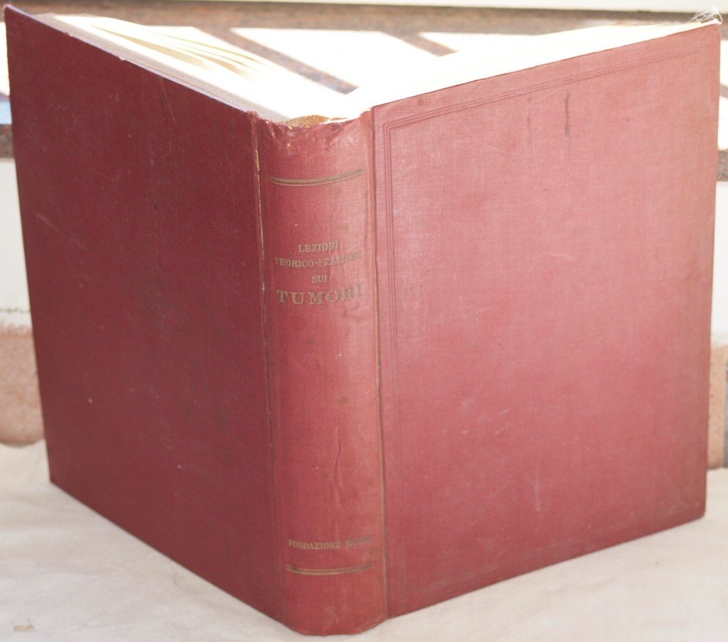 In 8. Dim. 27,5x20 cm. Pp. X+826+(2). Peso Kg. 2,400 Interessante opera del 1938 sui tumori edita dalla "Lega Italiana per la lotta contro i tumori". Si tratta delle lezioni teorico pratiche tenutesi durante il corso del giugno 1936 presso l'Istituto Regina Elena con il concorso della Lega Italiana per la lotta contro i tumori. L'opera è in un volume ed è completa. I principali argomenti trattati: fondamenti scientifici per lo studio dei tumori, terapia generale dei tumori, clinica diagnostica e terapia dei tumori nei singoli organi ecc. All'interno sono presenti numerose foto, planches e illustrazioni a colori e in bianco e nero. In buone condizioni Copertina in tela con titolo in oro al dorso in buone condizioni generali con lievi usure e parti mancnati ai margini e dorso. Legatura in buone condizioni ma rottura alla prima pagina di testo. All'interno le pagine si presentano in ottime condizioni con rare fioriture. Interesting work of 1938 abotu cancewrs edited by "Lega Italiana per la lotta contro i tumori". It is a series of theorical practical lesosns held during june 1936 in the june 1936 presso l'Istituto Regina Elena together with the Lega Italiana per la lotta contro i tumori. The work is in one volume and it is complete. The main issues treated: scientiphic concepts for the study of cancers, general therapy of cancers, diagnostic and therapy of cancers in single organs etc. Isndie there are different black and white and coloured photoes illustrations and planche In good conditions. Cloth cover with golden title in the spine in good general conditions slightly worn with missing parts in the edges and spine. Binding in good conditions with a crack in the first page of text. Inside pages are in very good conditions with occasional foxings.