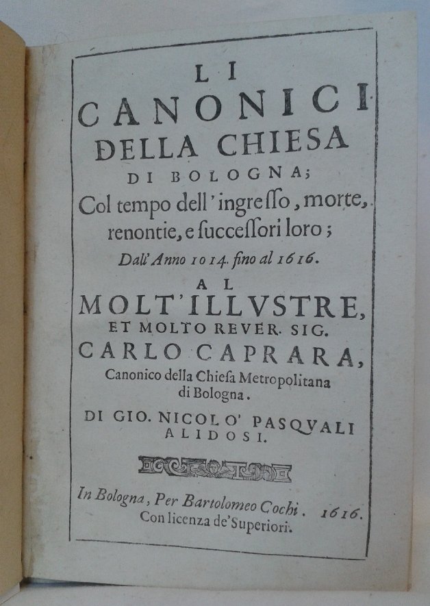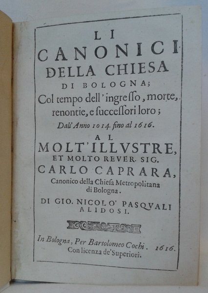 LI CANONICI DELLA CHIESA DI BOLOGNA COL TEMPO DELL'INGRESSO, MORTE, RENONTIE E SUCCESSORI LORO dall'anno 1014 fino al 1616. Al molto illustre et molto rever. Sig. Carlo Caprara.