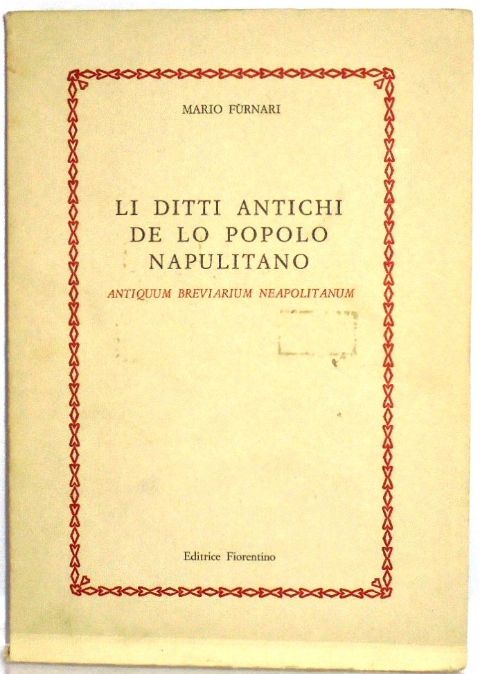 NAPOLI, FIORENTINO, . Prefazione di Michele Prisco. In 8∞: pp. 220. Br. edit. Interessante lavoro di un "dilettante appassionato", e non di "un filologo", sul folklore "de lo popolo napulitano", cosÏ come tramandato da tradizione popolare. Edizione illustrata da Disegni. Contiene: voci, stornelli e canti di amore, preghiere, imprecazioni e minacce, Il gergo camorristico, proverbi, prontuario italiano napoletano.