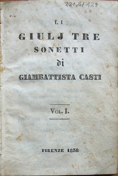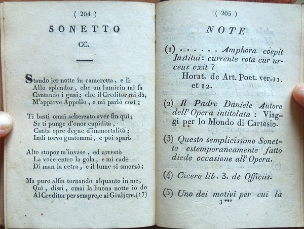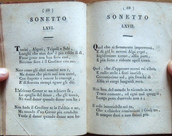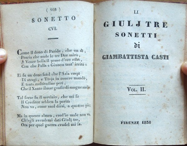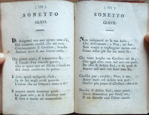 Due volumi in un tomo in-24° (12 x 8 cm), pagine con numerazione continua 108; 109-212, (4), legatura coeva in mezza pelle e angoli in pergamena, con titoli e fregi in oro al dorso. Tagli decorati a spruzzo. Manca la carta di guardia anteriore. Segnatura, alfanumerica, di mano coeva, nella parte superiore del frontespizio. Piccolo lavoro di tarlo nell'angolo inferiore interno del contropiatto posteriore. Qualche piccolo, leggero segno d'umido. Per il resto ben conservato.