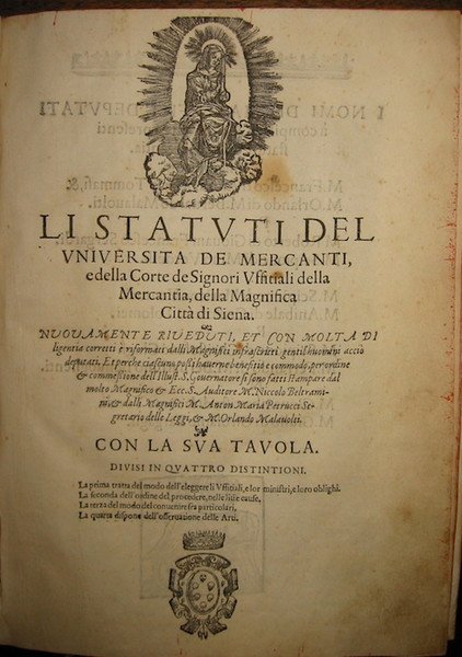 Li Statuti del Universita de Mercanti, e della Corte de Signori Uffitiali della Mercantia, della Magnifica Città di Siena. Nuovamente riveduti, et con molta diligentia corretti. Con la sua tavola. Divisi in quattro distintioni. La prima del modo dell’eleggere li Uffitiali, e lor ministri, e loro oblighi. La seconda dell’ordine del procedere, nelle liti e cause. La terza del modo del convenire fra particolari. La quarta dispone dell’osservatione delle Arti