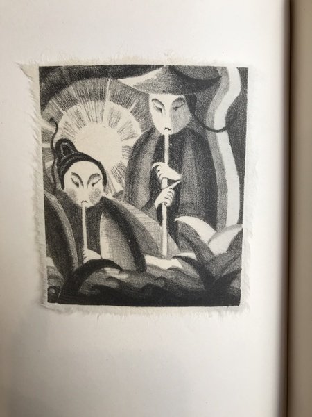 In-8°, pp. 16, 4 illustrazioni in litografia stampate su carta di riso e applicate, cartonatura editoriale in mezza pergamena, titolo in oro al dorso, al piatto superiore titolo impresso su carta di riso applicata. Taglio superiore dorato. Elegante testo di poesi cinesi selezionate e illustrate da Lily Streift dalla traduzione dello scrittore e poeta tedesco Klabund ( pseudomino Alfred Henschke). Edizione a tiratura limitata a 50 esemplari, il nostro è il n. 6