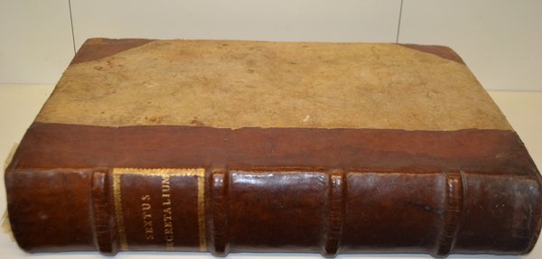 - legatura piena pergamena coeva , dorso e punte dei piatti ricoperti all'epoca di pelle, titolo oro al dorso ( 4 nervi)