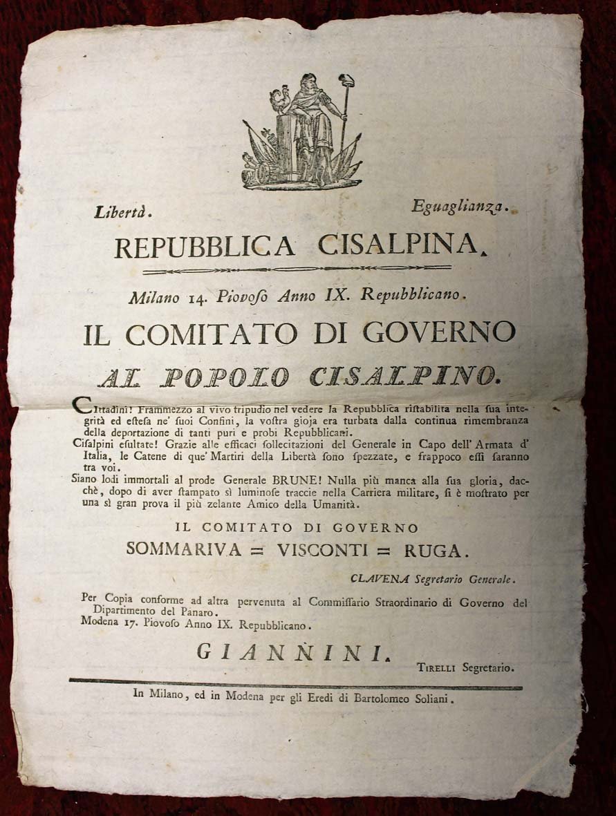 Manifesto di mm 440x320, piegato al centro. Bellissima copia intonsa. Il comitato governativo (Sommariva-Visconti-Ruga) annuncia il rientro in patria dei cittadini cisalpini deportati dagli Austro-ungarici a Sebenico, Cattaro e altri luoghi della Dalmazia, dove erano stati costretti ai lavori forzati.