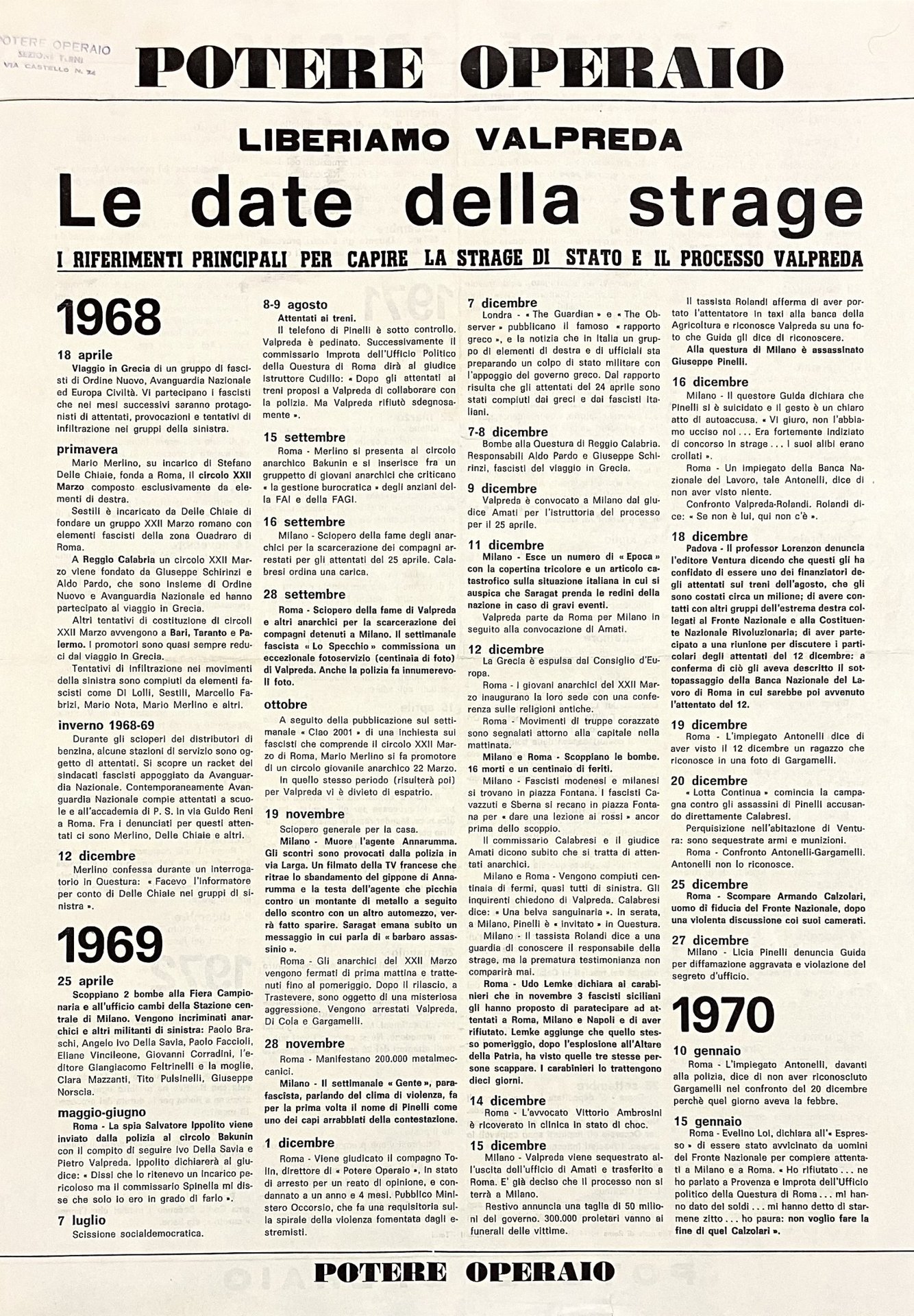 I riferimenti principali per capire la strage di Stato e il processo Valpreda: una puntuale ricostruzione cronologica sui movimenti impuniti dei gruppi fascisti (Ordine Nuovo e Avanguardia Nazionale), le eclatanti incongruenze del processo, i fermi e gli arresti a tutte le aree del dissenso, la presentazione del libro La strage di Stato, nonché le accuse al commissario Calabresi. Volantone stampato al recto e al verso, testo su quattro colonne. Timbro della sezione Terni di Potere Operaio al recto. Minimo strappo al margine inferiore ma ottimo.