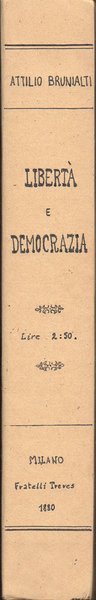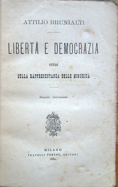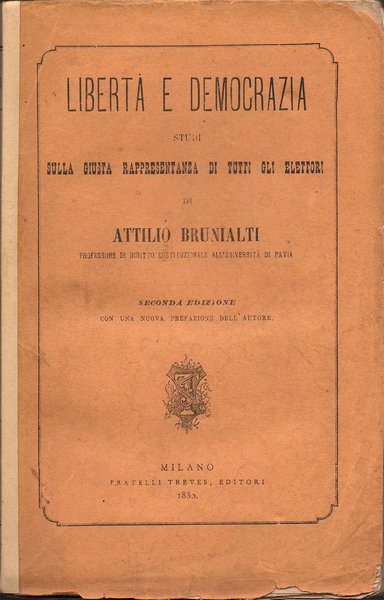 In-16° (19,2 x 12 cm), pp. LVI, 512, copertina editoriale con dorso rifatto. Qualche segno d'uso e del tempo alla copertina, con lievi mende ai bordi e, alla copertina posteriore, poche abrasioni con alcuni forellini, questi ultimi ben sistemati con carta giapponese applicata alla terza di copertina. Al dorso, titoli manoscritti che riproducono quelli della brossura originale. Nel margine esterno del foglio con le pagine 149-150, strappo, senza perdite, ben rimarginato con carta giapponese. Normale patina del tempo alle pagine, per il resto, ben conservato. Parzialmente intonso. La copertina riporta un titolo parzialmente differente rispetto a quello riportato al frontespizio, vale a dire: Libertà e democrazia. Studi sulla giusta rappresentanza di tutti gli elettori di Attilio Brunialti Professore di diritto Costituzionale all'Università di Pavia. Seconda edizione con una nuova prefazione dell'autore. Attilio Brunialti, giurista e uomo politico (Vicenza 1849 - Roma 1920), fu professore di diritto costituzionale all'università di Torino, consigliere di Stato, e deputato al parlamento. Si interessò in particolare di diritto pubblico, di geografia e di problemi coloniali. Indice: Prefazione; Introduzione; Parte prima. Le minorità e il suffragio universale. Capitolo I. Le minorità; Capitolo II. Il suffragio universale; Capitolo III. I temperamenti alla universalità del voto e la rappresentanza delle minorità. Parte seconda. La rappresentanza delle minorità in Europa, in America ed in Australia. Capitolo I. La rappresentanza delle minorità in Inghilterra. 1. Tommaso Hare; 2. La democrazia in Inghilterra e la riforma elettorale del 1867; 3. La rappresentanza delle minorità nel parlamento inglese; Capitolo II. La rappresentanza delle minorità nella Svizzera, in Germania, nel Belgio, in Olanda, in Francia ed in Australia. 1. La Svizzera - I cantoni di Ginevra e di Neuchatel; 2. Francoforte (sul Meno) e la Germania; 3. Belgio e Olanda; 4. Francia; 5. Australia; Capitolo III. La rappresentanza delle minorità nelle legislazioni elettorali della Danimarca, nella nuova Galles meridionale e degli Stati Uniti d'America. 1. La Danimarca; 2. Nuova Galles Meridionale; 3. Stati Uniti d'America. Parte terza. Il principio di proporzionalità e il principio della maggiorità. La rappresentanza delle minorità e la questione elettorale in Italia. Capitolo I. Dove si confutano le principali obiezioni fatte al principio di proporzionalità; Capitolo II. Le minorità ed i partiti; Capitolo III. Teoria e pratica; Capitolo IV. La questione elettorale e la rappresentanza delle minorità in Italia; Conclusione. Appendice I. Legge elettorale proposta da T. Hare; II. Programma dell'Associazione Riformista di Ginevra; III. Statuto dell'Associazione Riformista di Ginevra; IV. Progetto di legge presentato al Gran Consiglio del cantone di Ginevra nella sessione ord. del maggio 1869 dai dep. Morin, Bellamy e Roget; V. Progetto di legge elettorale di A. Morin; VI. Progetto di legge per la elezione dei membri del Gran Consiglio del cantone di Neuchatel; VII. Legge danese del 1855 per la elezione dei rappresentanti ai Rigsrad; VIII. Riforma elettorale - Lavori non citati nel corso dell'opera o comparsi durante la stampa della medesima.