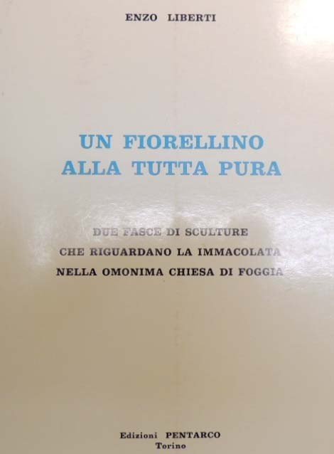 Enzo Liberti, Un fiorellino alla tutta pura. Due fasce di sculture che riguardano la Immacolata nella omonima chiesa di Foggia, Edizioni Pentarco, Torino 1992, prima ed., pp. 53, in gran parte ill. b.n., cm 22, br. ed. Collana Ulivo. Presenze artistiche. La pubblicazione illustra e riproduce le fasce di bassorilievi in ceramica realizzate da Enzo Liberti (1926-1986) per la Chiesa dell’Immacolata di Foggia e inaugurate l’8 dicembre 1961. Perfetto. Raro.