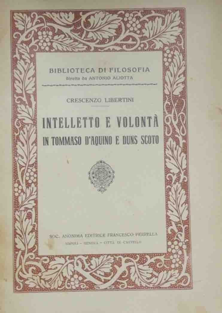 Crescenzo Libertini, Intelletto e volontà in Tommaso d’Aquino e Duns Scoto, con pref. di Antonio Aliotta, Soc. Anonima Editrice Francesco Perrella, Napoli 1926, pp. 124, cm 26, br. ed. Collana Biblioteca di filosofia. Dedica manoscritta alla prima pagina. Tracce d’uso alla brossura, con bruniture, piccole mancanze al dorso e alla quarta di copertina e dorso restaurato, per il resto interno in buono stato di conservazione con carta uniformemente brunita. Intonso. Raro.