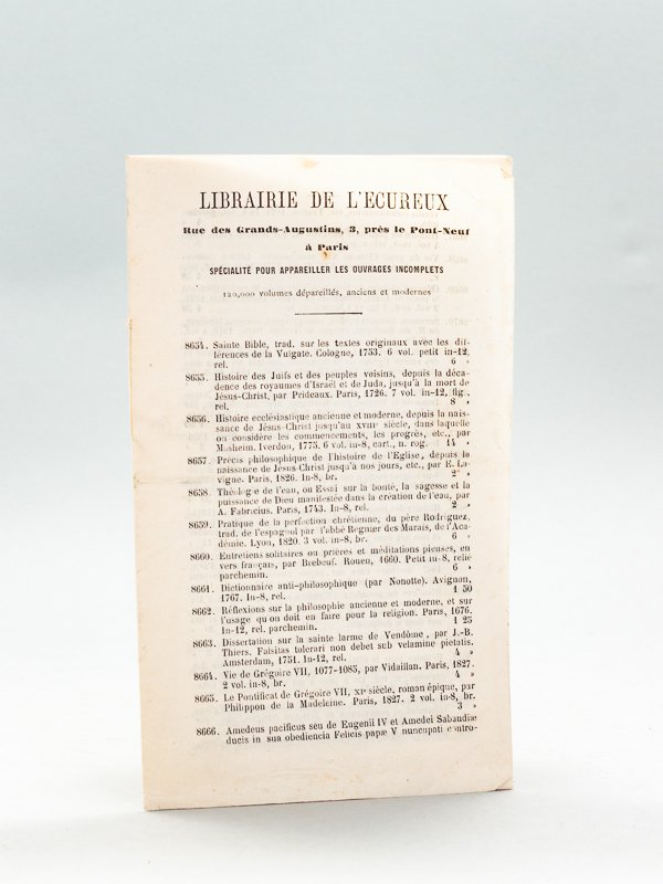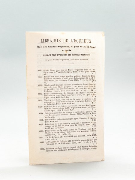 Librairie de l'Ecureux. Rue des Grands Augustins, 3, Près le Pont-Neuf, à Paris. Spécialité pour appareiller les ouvrages incomplets. 120.000 volumes dépareillés, anciens et modernes [ Catalogue ]