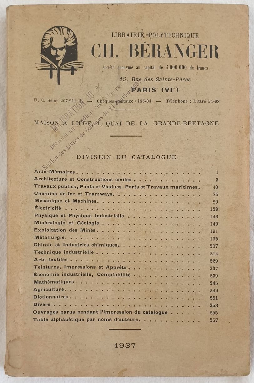 Catalogo del 1937 della Libreria politecnica Ch. Beranger di Parigi. All'interno divisione tematica: memorie, architettura e costruzionmi civili, lavori pubblici, meccanica, elettricità, fisica, mineralogia, sfruttamento delle miniere, metallurgia, chimica, tecnica industriale, arte tessile, vernici, economia industriale, matematica, agricoltura, dizionari, agricoltura ecc. In buone condizioni. Copertina editoriale in buone condizioni generali con lievi usure ai margini e dorso. Legatura in buone condizioni. Pagine in buone condizioni con rare fioriture. In 8. Dim. 21x14 cm. Pp. LXIV+286+(2). Catalogue of 1937 of the Library Ch. Beranger di Parigi. Inside division in subject: memories, architecture and civil constructions, public works, mechanics, electricity, physics, mineralogy, exploiting of mines, metallurgy, chemistry, industrial techniques, textile art, industrial economy, matematics, agricolture ecc. In good conditions Editorial cover in good general conditions slightly worn in the extremities. Binding in good conditions. Inside pages are in good conditions with occasional foxings. In 8. Dim. 21x14 cm. Pp. LXIV+286+(2).