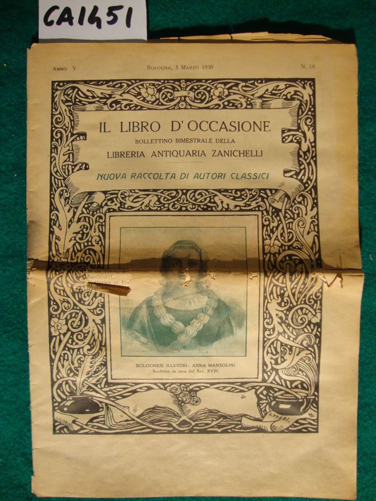 Opuscolo. Catalogo in formato opuscolo in brossura spillata con copertina editoriale a stampa a pubblicazione bimestrale. Disponiamo del seguente catalogo relativo all'anno 1930 : n. 18 del 5 marzo; nuova raccolta di autori classici. In copertina - Bolognesi illustri: Anna Manzolini - - DETTAGLIO DELLE CONDIZIONI : Segni d'uso alle copertina con minute fioriture, strappi che interessano varie pagine e aloni sparsi - (33h).