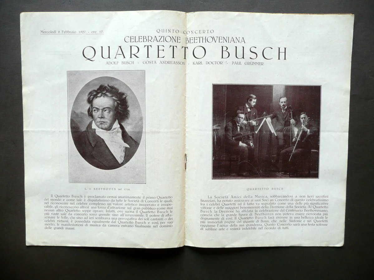 Libretto, Società Amici della Musica Napoli Stagione XII - Anno XII La grande stagione di concerti 1926-27 Celebrazione del centenario beethoviano col quartetto busch ITEA - Napoli 1926; cm 24x17; pp. non num. (pp. 16), con varie ill. fotogr. seppiate nel t.; brossura ed. Condizioni di conservazione Esemplare ben conservato con tracce d'uso, lieve traccia di piega centrale di conservazione, brossure con alcuni piccoli lievi aloni e minime tracce di sporco. Interni con poche minuscole bruniture. SC03.D12890 N