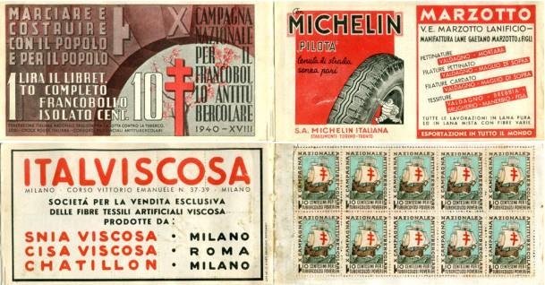 Campagna Nazionale per il Francobollo Antitubercolare. Completo con 10 francobolli e belle pubblicità \Italviscosa - Michelin e Marzotto\". Libretto 17x9. Raro completo e in queste condizioni, Ottimo." , Buono (Good)