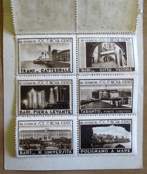 XXII Riunione Società Italiana Progresso delle Scienze - Bari 12-18 Ottobre 1933. Creazioni Scarano. Libretto Completo con 12 francobolli delle più belle località della Puglia. Libretto 12,5x11. raro e in Ottimo stato. ,