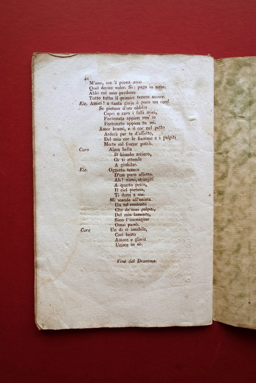 Libretto d'opera, il Furioso all'isola di San Domingo melodramma in due atti poesia del Sig. Giacopo Ferretti musica del Maestro Sig. Cav. Gaetano Donizetti Dalla Tip. di Giuseppe Molinari, Venezia 1840; cm 18,5x12,5; pp. 40; brossura d'epoca in cartoncino marmorizzato, con titolo annotato a mano. Al frontespizio piccolo timbro-ex libris e vecchia firma di possesso. Condizioni di conservazione Buone condizioni con tracce d'uso, brossura con qualche piccola lieve abrasione, angoli delle brossure e di alcune pagine con minime pieghette; titolo al dorso parzialmente rimosso. Interni buoni con alcune leggere bruniture e lievi ombre di gore che non compromettono la lettura del testo. Cantanti interpreti non indicati. SC03.D17940 N