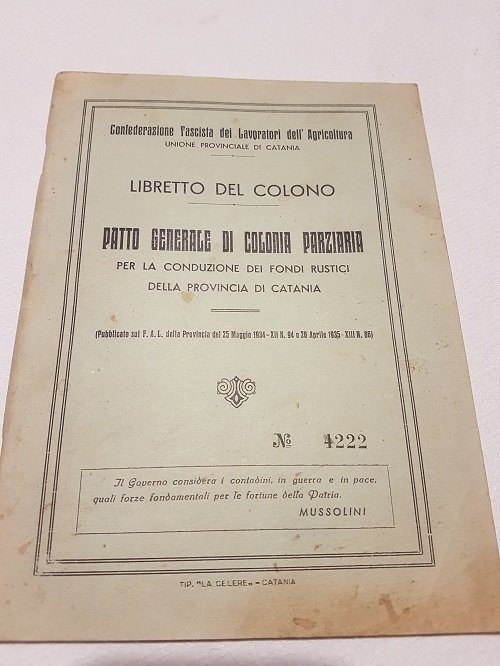 LIBRETTO DEL COLONO PATTO GENERALE DI COLONIA PARZIALE PER LA CONDUZIONE DEI FONDI RUSTICI DELLA PROV. DI CATANIA