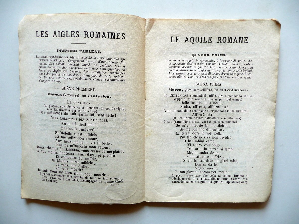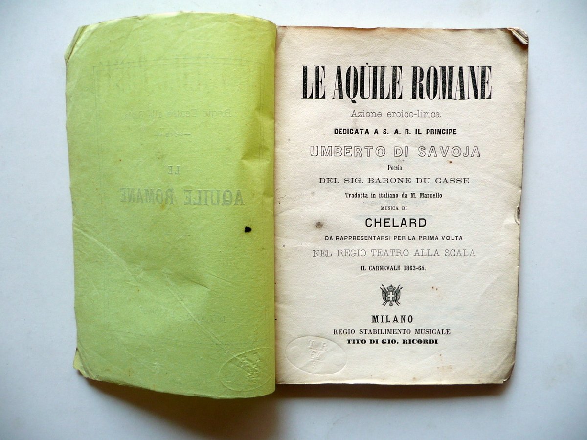 Libretto d'opera, Le Aquile Romane Azione eroico - lirica Dedicata a S. A. R. il Principe Umberto di Savoia Poesia del Sig. Barone du Casse Tradotta in italiano da M. Marcello Musica di Chelard Da rappresentarsi per la prima volta nel Regio Teatro alla Scala Il carnevale 1863 - 64 Ricordi, Milano 1863; cm 17x12,5, pp. 50; brossura ed. d'attesa. Testo originale francese a fronte. Condizioni di conservazione Esemplare in buone condizioni con tracce d'uso; brossure con qualche lievissimo alone e trascurabili accenni di sporco; angoli delle brossure e di alcune pagine con una piccola pieghetta o accenno di pieghetta; dorso con pochi minimi strappetti e una minuscola mancanza alla cuffia sup. Non comune libretto d'opera realizzato in occasione della prima rappresentazione italiana al Teatro alla Scala di Milano (per l'elenco dei cantanti - interpreti vedi foto). Testo originale francese a fronte. SETT102.L9707 N P
