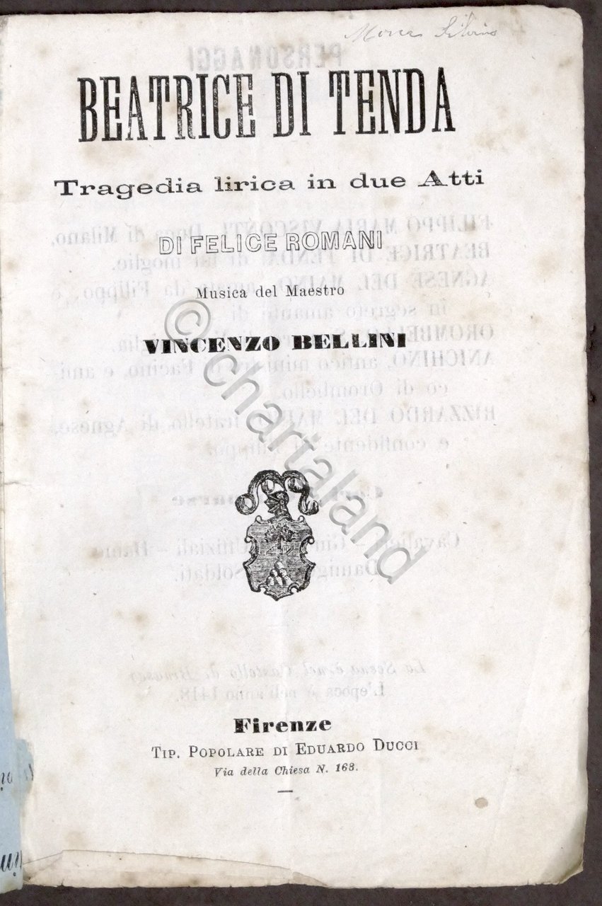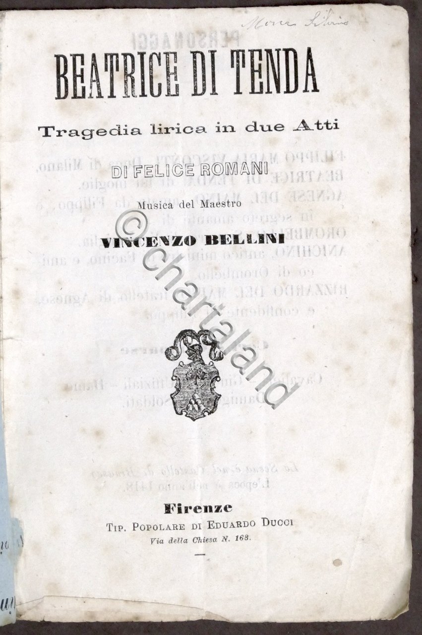 Libretto Opera - V. Bellini - Beatrice di Tenda Firenze, Tipografia Popolare di Eduardo Ducci - 1840 ca. Pag. 26 Copertina morbida - Testo in italiano. Condizioni discrete. Copertina come da foto.
