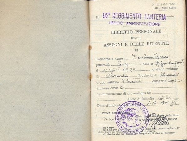 In 16°, br., pp. 35 ca. Il libretto presenta timbri del 92° Reggimento Fanteria, Ufficio amministrazione. Risultano mancanti le pag. da 29 a 44 , naturalmente strappate come cedole di pagamento.