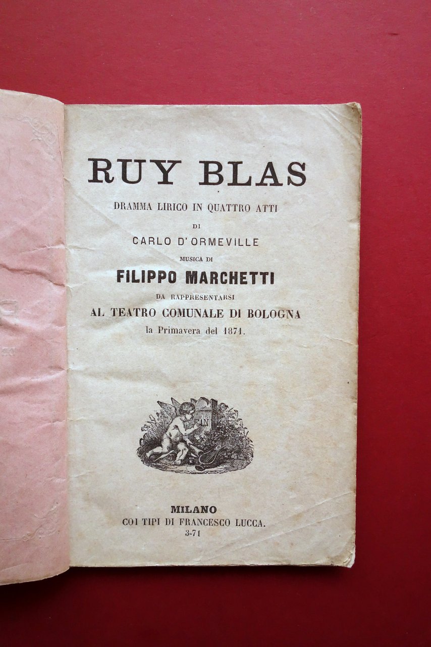 Libretto, Ruy Blas" dramma lirico in quattro atti di Carlo d'Ormeville musica di Filippo Marchetti da rappresentarsi al Teatro Comunale di Bologna la primavera del 1871 Coi Tipi di Francesco Lucca, Milano 1871; cm 17,5x11,5; pp. 68; brossura ed. d'attesa. Condizioni di conservazione Buone condizioni con tracce d'uso e lievi segni del tempo; brossura minimamente sgualcita e con piccole pieghette agli angoli della brossura anteriore. Interni buoni con alcune minime bruniture; angoli di qualche pagina con minime pieghette. Indicati i nomi degli interpreti. OPEB.5622 N "