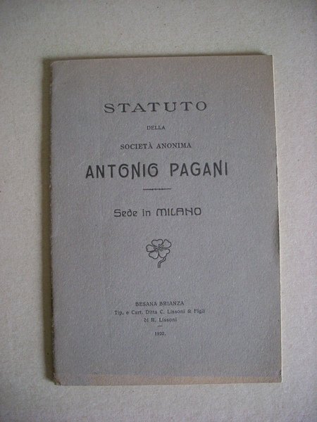 Libretto STATUTO Società Anonima ANTONIO PAGANI Milano 1920 (Tip.Besana Brianza)