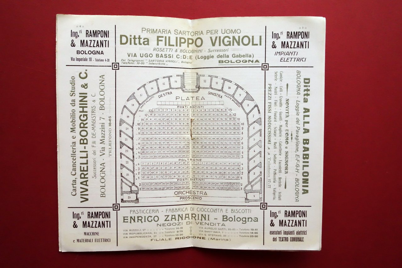 Libretto - programma di tournee, Tournee Bonci Teatro Comunale - Bologna 6 - 7 febbraio 1915 due sole recite straordinarie del comm. Alessandro Bonci Elisir d'Amore - Don Pasquale di G. Donizetti Impresa Pasquali Coop. Tip. Mareggiani, Bologna 1915; cm 20,5x11,5; pp. 8; alla doppia pagina centrale pianta del Teatro Comunale di Bologna. Brossura ed. con bella grafica cromolitografica. Condizioni di conservazione Buone condizioni con tracce d'uso, brossura con alcune lievi bruniture e aloni. Interni buoni. OPEB.5631 N