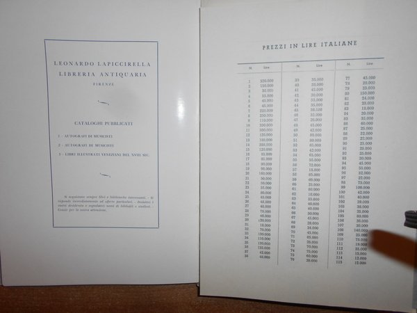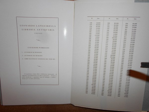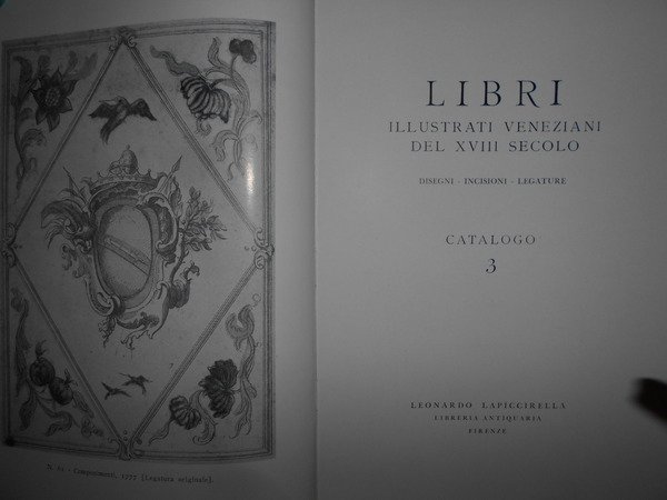 LEONARDO, LAPICCIRELLA. Firenze, Libreria Antiquaria Leonardo Lapiccirella, s.d. LIBRI Illustrati Veneziani del XVIII Secolo disegni - incisioni - legature. Catalogo 3. In-8°, cart. edit. con sovracopertina. 157, (2) pp. In fine foglio con prezzi in lire italiane. Uff. A - II - 3 - 2