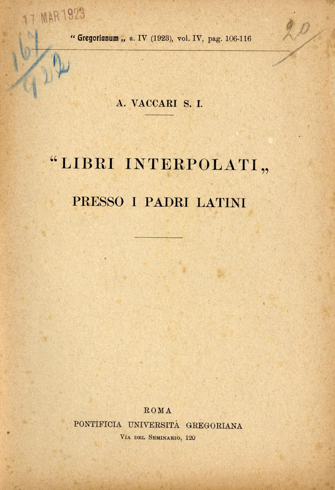 Estratto da Gregorianum, anno IV (1923), vol. IV, pp. 106-116. 200 � Ba In Ottavi (15-23cm ) Buono (Good) Buono