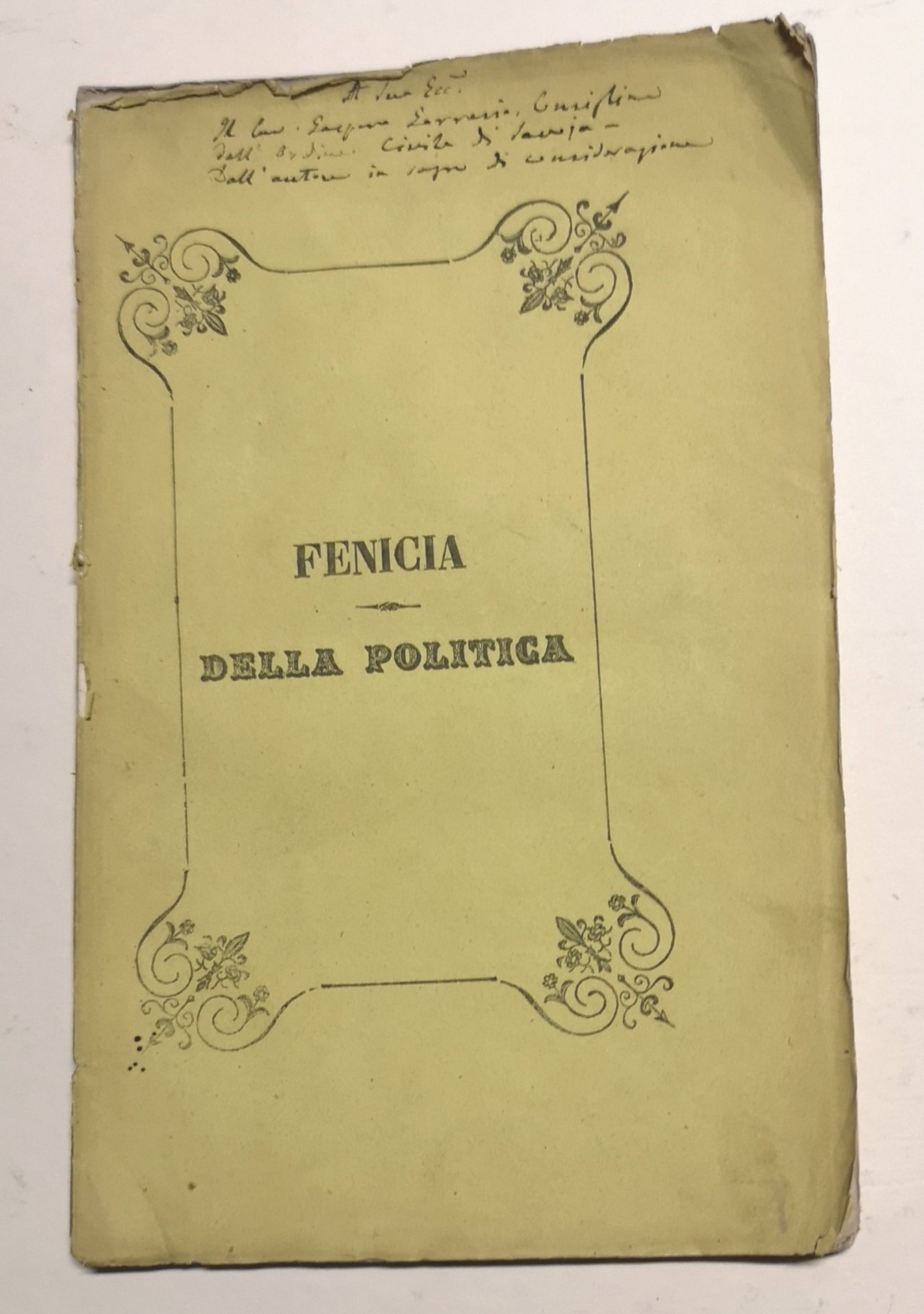 >in-8, pp. 86, broch. edit. con titolo entro cornice tipografica al piatto ant. Estratti dal terzo dei dodeci volumi manoscritti di tal opera, da lui completata fin dal milleottocentotrentaquattro. Edizione non comune. Ottimo esemplare, a fogli chiusi, con dedica ms dell'A. alla coperta.