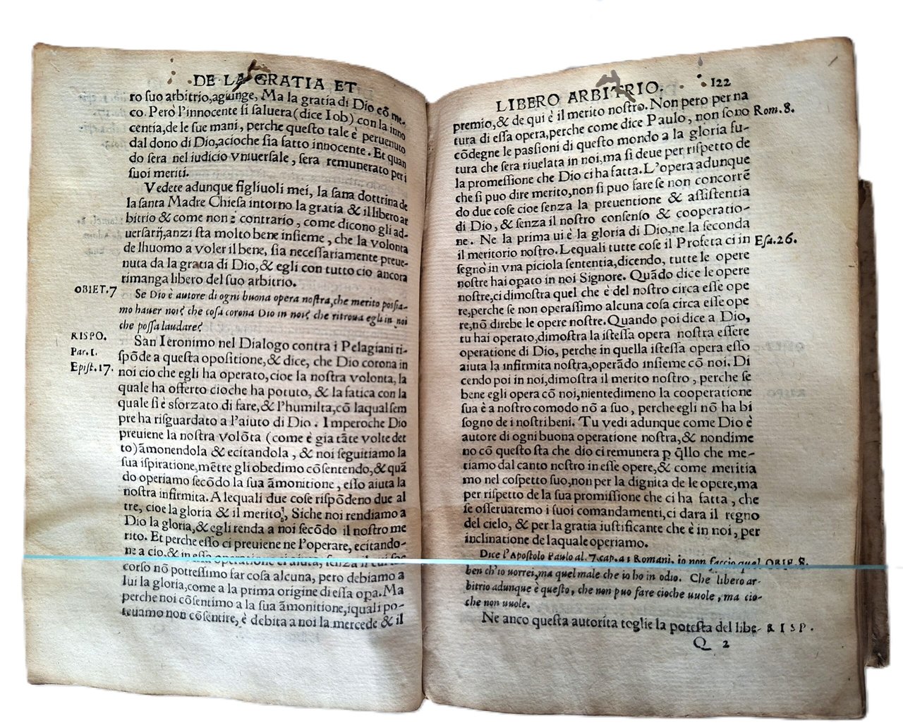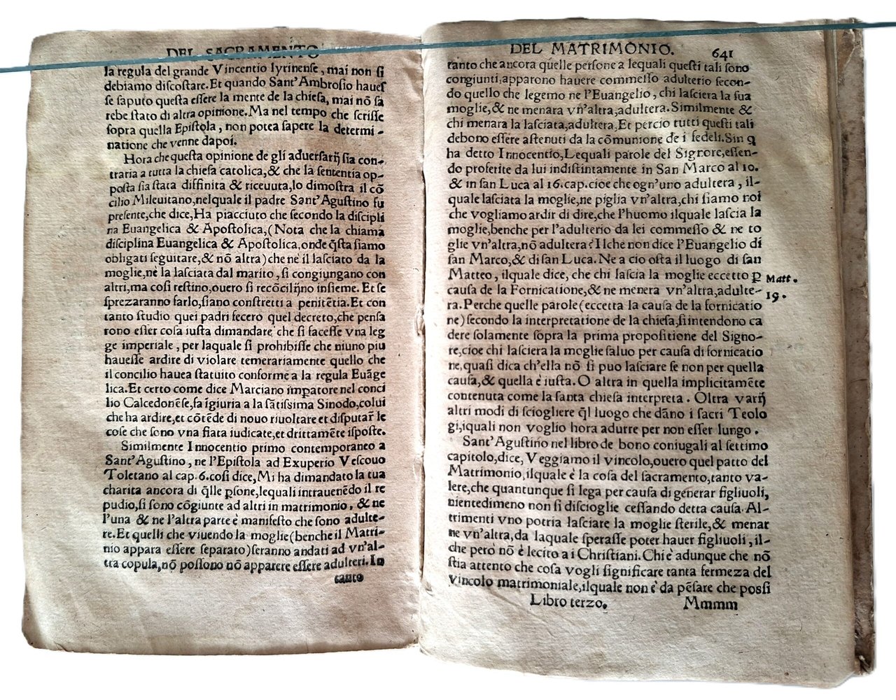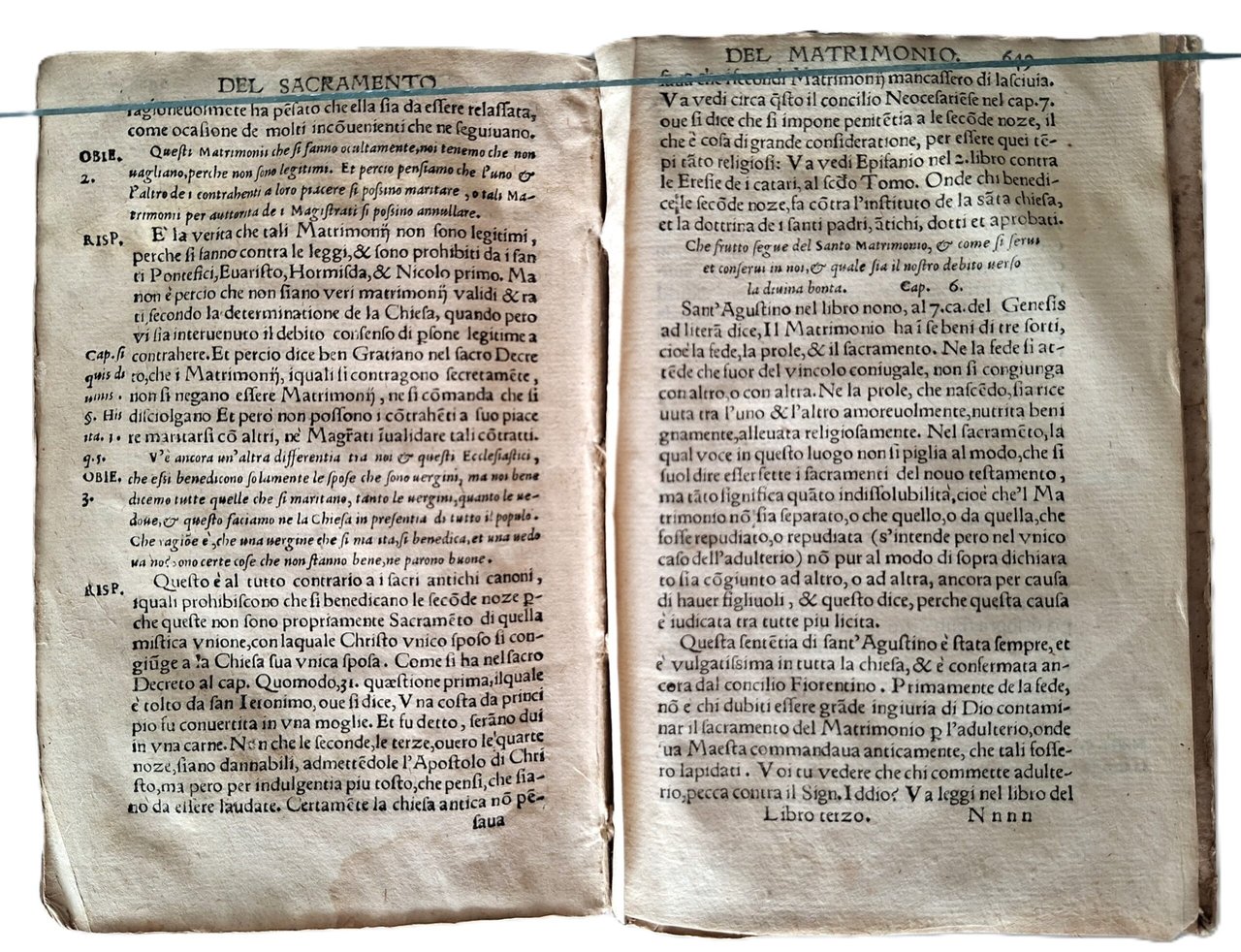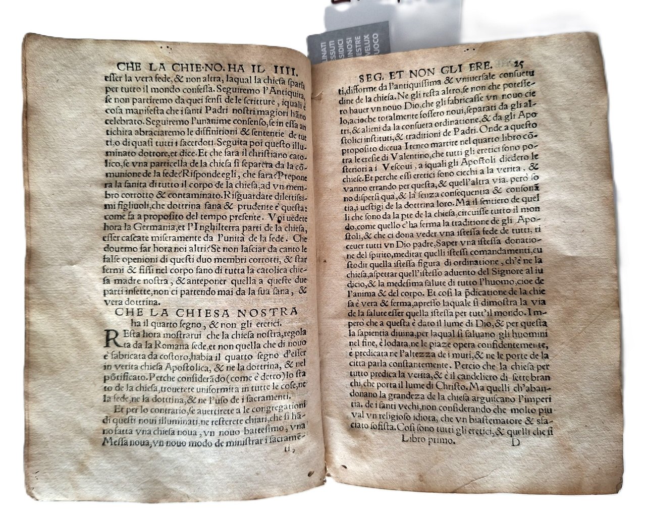 In-8°, mm. 155x120, carte (4), 652. Completo. Cartonato coevo. Piatto posteriore distaccato. Titoli manoscritti al dorso (sbiaditi). Leggera gora al lato inferiore di quasi tutto il volume, sporadiche fioriture. Piccoli lavori di tarlo al margine inferiore dalla carta 18 fino alla c. 100, con perdita di testo, altra galleria di tarlo dalla carta 90 alla carta 200 con perdita di testo, altra galleria di tarlo dalla carta 240 alla carta 273, una piccola macchia con perdita di testo alla carta 360, Un piccolo foro all'angolo inferiore destro della carta 399, mancanza al margine inferiore della carta 455. Capilettera xilografici. Note a matita recenti, e altre note a penna coeve. Tagli bruniti e impolverati, legatura con alcuni strappi, macchie e mancanze. Impressa in Venezia il 1555 (la prima 1553), opera di Luigi Lippomano (1496-1559) contro la dottrina protestante, tratta tra l'altro della dottrina della Chiesa: primato e infallibilità del papa (I), grazia, predestinazione e giustificazione (II), sacramenti (III). Opera originale di Maffeo Albertini (XVI sec.) e Giovanni Del Bene (XVI sec.) riveduta e ampliata dall'autore. Marca tipografica in xilografia al frontespizio.