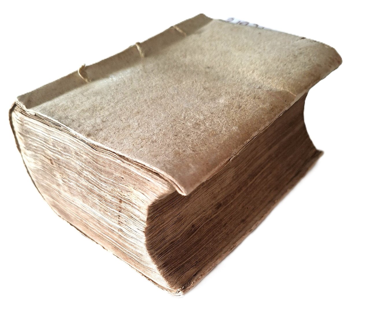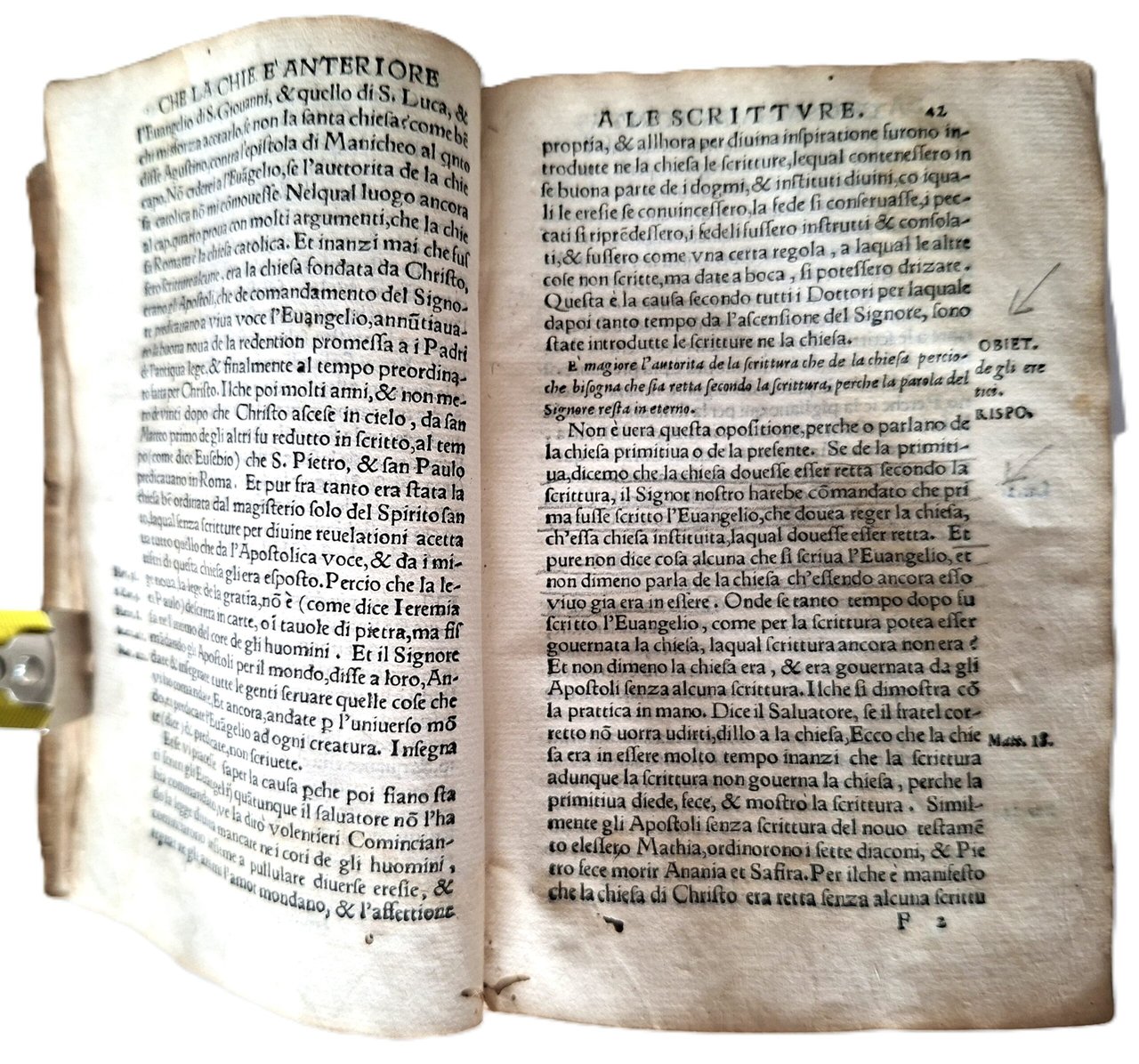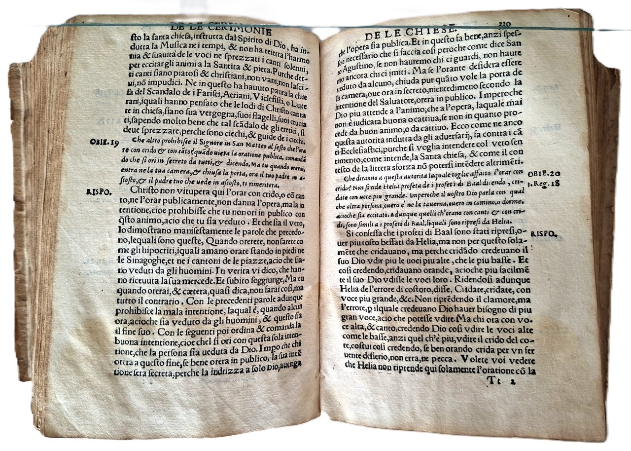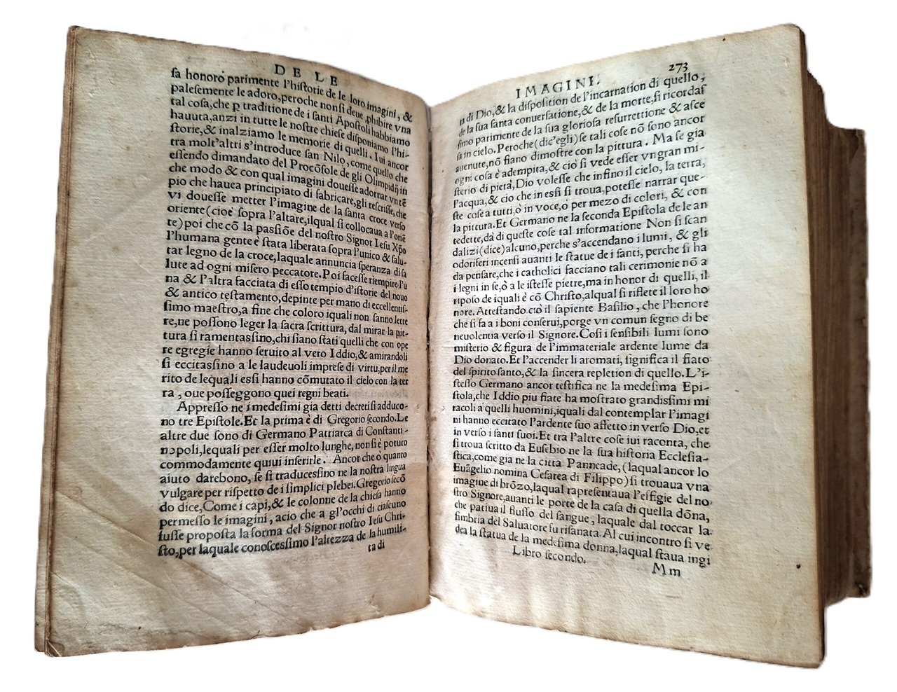 In-8°, mm. 155x120, carte (4), 652. Completo. Cartonato coevo. Piatto posteriore distaccato. Titoli manoscritti al dorso (sbiaditi). Leggera gora al lato inferiore di quasi tutto il volume, sporadiche fioriture. Piccoli lavori di tarlo al margine inferiore dalla carta 18 fino alla c. 100, con perdita di testo, altra galleria di tarlo dalla carta 90 alla carta 200 con perdita di testo, altra galleria di tarlo dalla carta 240 alla carta 273, una piccola macchia con perdita di testo alla carta 360, Un piccolo foro all'angolo inferiore destro della carta 399, mancanza al margine inferiore della carta 455. Capilettera xilografici. Note a matita recenti, e altre note a penna coeve. Tagli bruniti e impolverati, legatura con alcuni strappi, macchie e mancanze. Impressa in Venezia il 1555 (la prima 1553), opera di Luigi Lippomano (1496-1559) contro la dottrina protestante, tratta tra l'altro della dottrina della Chiesa: primato e infallibilità del papa (I), grazia, predestinazione e giustificazione (II), sacramenti (III). Opera originale di Maffeo Albertini (XVI sec.) e Giovanni Del Bene (XVI sec.) riveduta e ampliata dall'autore. Marca tipografica in xilografia al frontespizio.