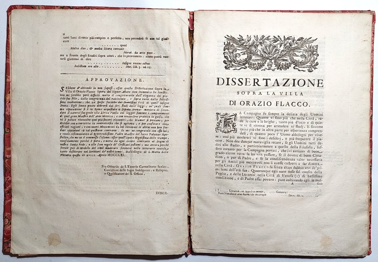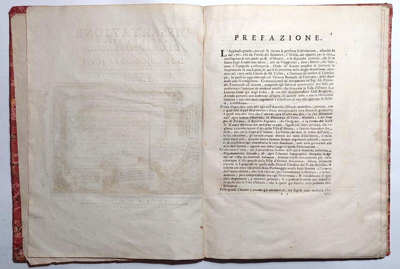 Dissertazione sopra la Villa di Orazio Flacco 1768.Manca la carta in fondo al volume. Seconda edizione cm. 29 x 21 pp. 6 + 41
