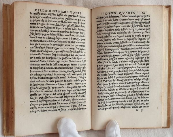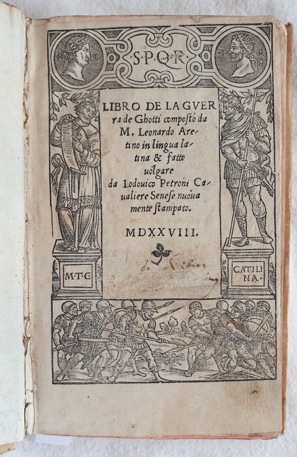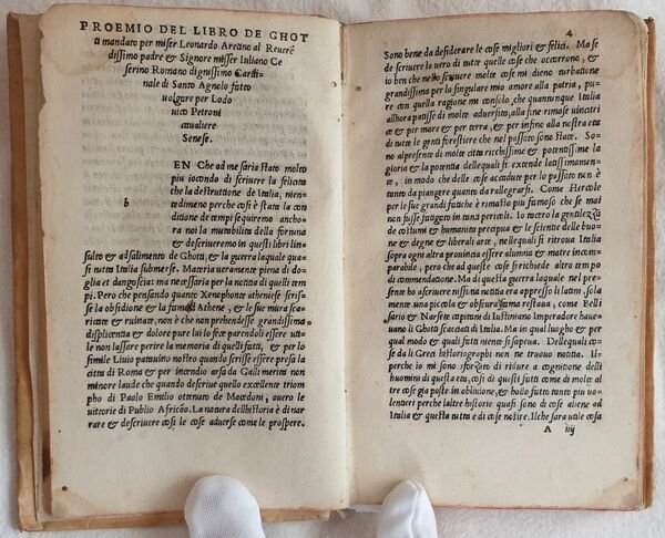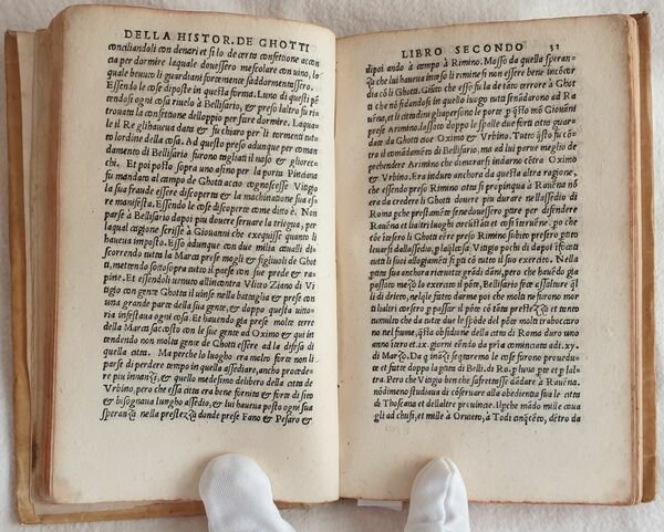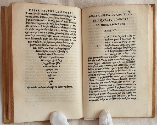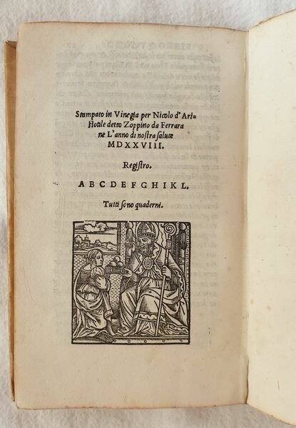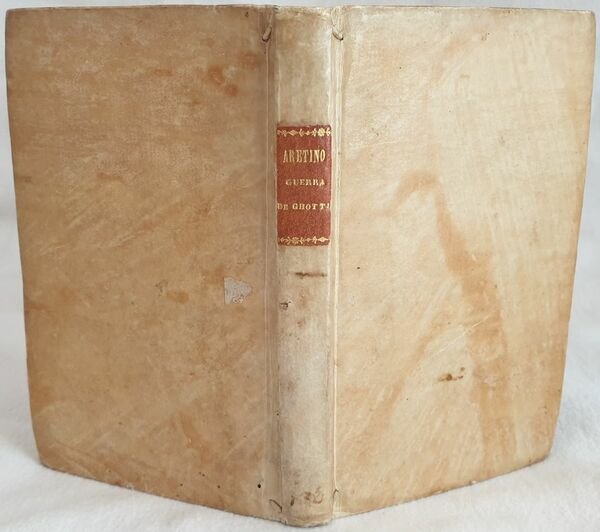 Prima edizione uscita dai torchi di Zoppino e pubblicata dopo quella impressa da Giunta a Firenze nel 1526 di questa opera storica sulla guerra dei Goti e Longobardi di Leonardo Bruni (1370-1444) umanista e politico. Bruni fu segretario apostolico e cancelliere della Repubblica fiorentina dal 1427. Nato ad Arezzo e morto a Firenze (Rif. Edit16). Traduzione in lingua italiana di Lodovico Petroni dedicata a Conte Galezzo Sforza. Bel frontespizio figurato. Antiche note manoscritte alle sguardie. Indicazione dello stampatore al colophon e bella marca xilografica che mostra San Nicola in trono: con la mano sinistra regge il pastorale e con la destra accoglie il cesto delle offerte portato da una donna inginocchiata. Numerazione al recto. Copertina settecentesca e carta decorata ai contropiatti. Tagli rossi. In ottime condizioni. Coperta in piena pergamena settecentesca con titolo su tassello al dorso in ottime condizioni generali con lievi usure ai margini e dorso. Legatura in buone condizioni. Pagine in ottime condizioni con rare fioriture e qualche piccola gora d'umidità. Piccoli segni di tarlo marginali alle prime 15 carte con leggera perdita di testo In 16. Dim. 16x10,5 cm. Pp. (87)+(1) First edition by Zoppino after the Giunta edition published in Florence in 1526 of this historical work about the war of Gotes and Longobards written by the humanist and politician Leonardo Bruni (1370-1444). Bruni was segretary and chancellier of Florentine Republic from 1427. He was born in Arezzo and died in Florence (Rif. Edit16). Italian translation by Lodovico Petroni dedicated to Conte Galeazzo Sforza. Beautiful figurated title page. Ancient handwritten notes in the edndpages. Indication of publisher in colophon and beautiful woodcut featuring San Nicola in throne. Numbering in recto. Cover of 18th century and decorated paper in counterplates. Red external edges of pages. In very good conditions. Parchment cover of 18th century with spine title leather label in very good general conditions slightly worn in the edges and spine. Binding in good conditions. Pages are in very good conditions with occasional foxings and some little dump stains. Little wormings int he edges of the first 15 pages with slight loss of text. In 16. Dim. 16x10,5 cm. Pp. (87)+(1)