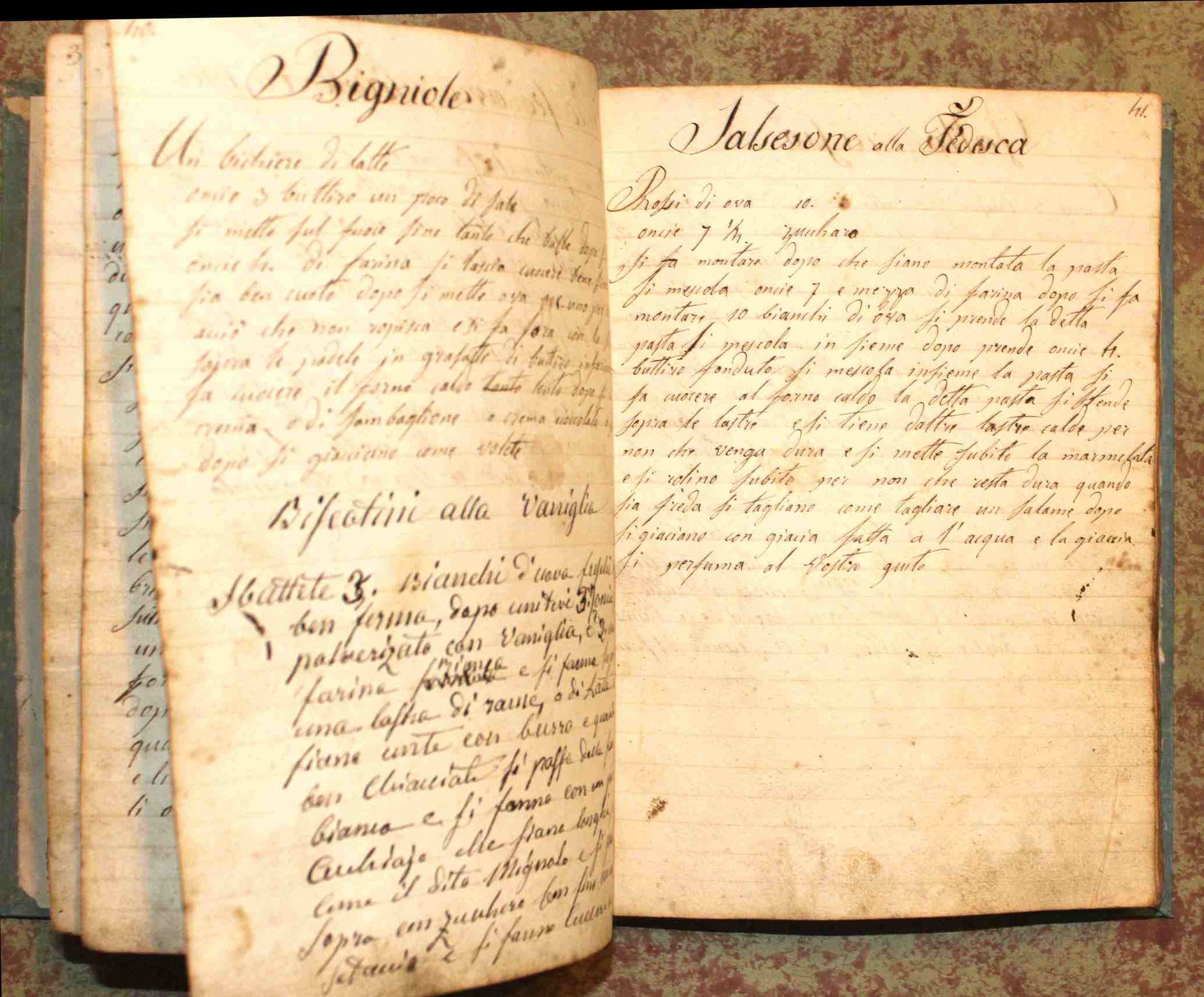 Manoscritto in 4° (cm. 25 x 18), in italiano. Pp. 264 scritte, con qualche salto di numerazione. Rilegatura dell'epoca in mezza pergamena con dorso muto. Il testo è scritto in corsivo su pagine a righe. Sono presenti ingialliture e una macchia bruna alle ultime 40 pagine (che contengono l'indice o sono bianche). Raccolta di circa 350 ricette, molte delle quali tipiche della tradizione piemontese, come i Canestrelli, i Ciccioni di Alba, le Bignole, Torcetti d'uso di Pinerolo, vari tipi di torroni. Una sezione è dedicata alla preparazione dei liquori e sciroppi, tra questi il Vermuth, il Ratafià di Cumiana, vari estratti ed elisir. Sono poi presenti molte altre ricette di pasticceria: Panettone di Milano, Mostarda di Cremona, Caramelle di vaio tipo, Confetti, gelatine, Biscottini di Siena, Mostaccioli di Napoli, Marrons glacées. Tra gli ingredienti utilizzati figurano anche il caffè e il cioccolato. Datato 15 settembre 1852, il manoscritto è stato composto da Pietro Fabiano, che si qualifica come apprendista in 'Casa Bas ai Portici della Fiera di Torino (piazza Castello), primo confettiere e liquorista di Torino'. Si tratta della rinomata confetteria e liquoreria fondata nel 1810 dallo svizzero J. Bass in Piazza Castello.
