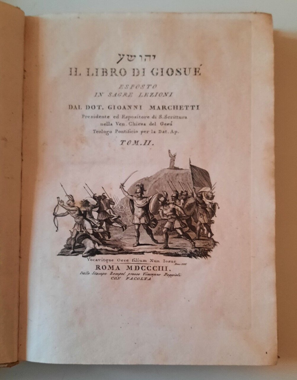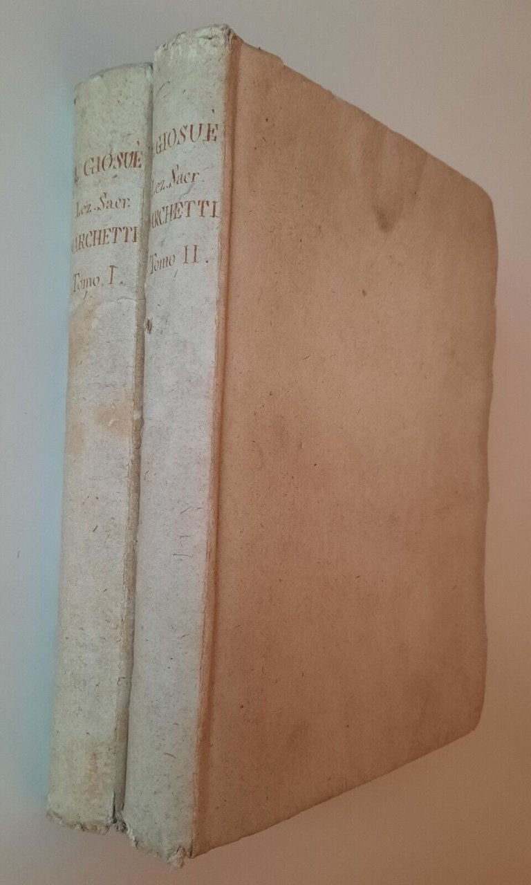 LIBRO DI GIOSUE' ESPOSTO IN SAGRE LEZIONI G. MARCHETTI V. POGGIOLI 1803 2 VOL.In 4°, 2 volumi, pag. [10] 375 + [2] XV 411 , legatura in cartonato d'attesa con titolo ad inchiostro al dorso, incisione al frontespizio, 21 tavole a piena pagina + 1 ripiegata con carta della terra promessa, testatina incisa al primo volume .Tenui macchie alle sguardie e alle prime pagine bianche. Tenui macchie alle restanti pagine. Taglio alla pag. 1 del primo volume.