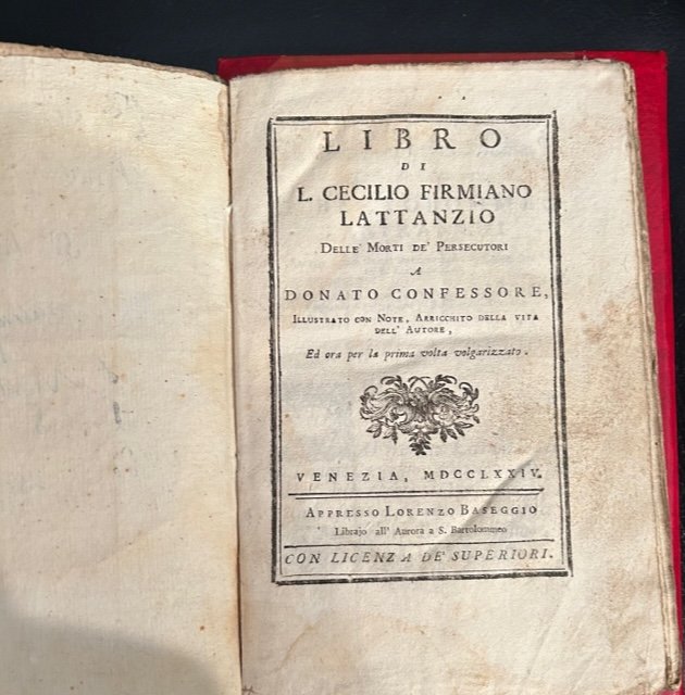 Libro Di L. Cecilio Firmiano Lattanzio Delle Morti De Persecutori a Donato Confessore. Illustrato con note, arrichhito della vita dell'autore, ed ora per la prima volta volgarizzato.