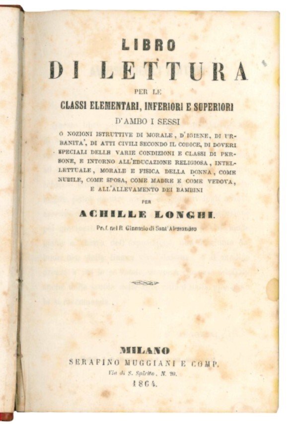 Mm. 167x105. Pp. 208. C. lievemente ed uniformemente brunita, prime cc. fiorite. Rilegato editoriale in mezza pelle, impressione a caldo del busto di Cesare Beccaria al piatto anteriore e di Cristoforo Schmid a quello posteriore, dorso con titolo e ornamenti dorati. Punte lievemente usurate, al contropiatto anteriore ex-libris di Silva Domenico del seminario Vescovile d'Ivrea.