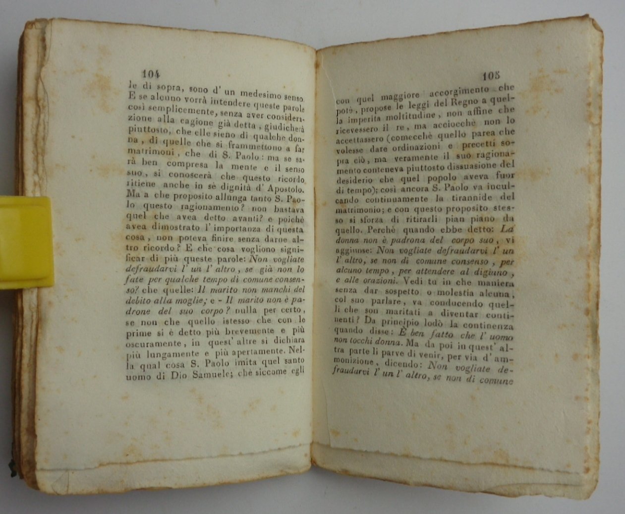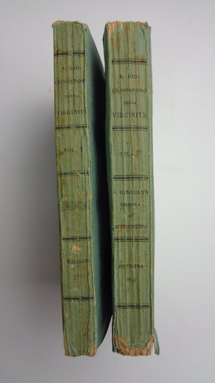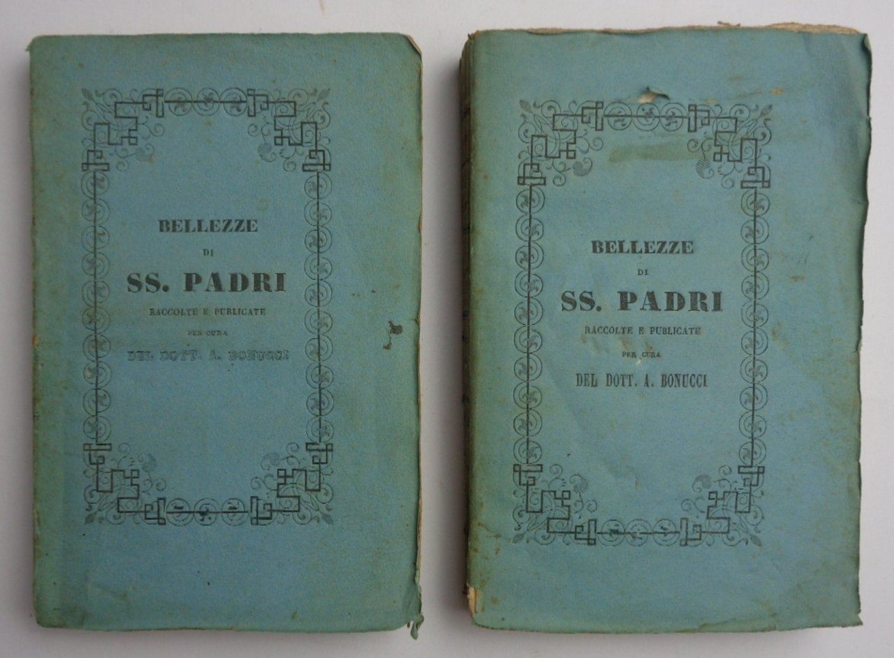 Due volumetti (10x16 cm) di 200+236 pagine, brossura editoriale cartacea con alla copertina il titolo «Bellezze dei SS. Padri». In barbe. Minime tracce d'uso. In pratica, un manuale di comportamento virtuoso per fanciulle, donne, mogli.
