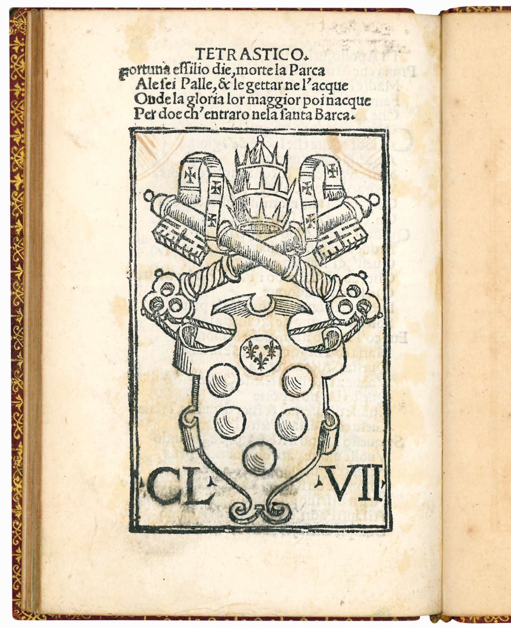 8vo (148x100 mm). [28] leaves. Collation: a-g4. Title page within an elegant woodcut border depicting war trophies and armored soldiers on horseback. Woodcut coat of arms of Clement VII on last leaf verso. Later red morocco gilt, marbled endleaves, gilt edges (spine and joints repaired). On the title page later ownership entry of Alessandro Volpi (fl. 1844-1857), veterinary doctor and bibliophile. A very good copy.